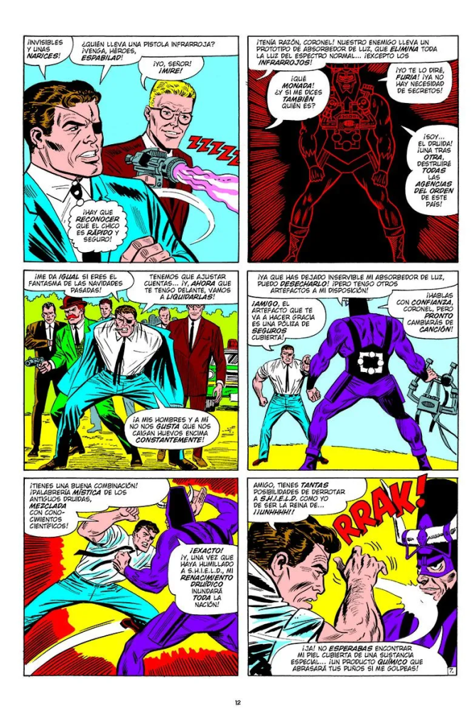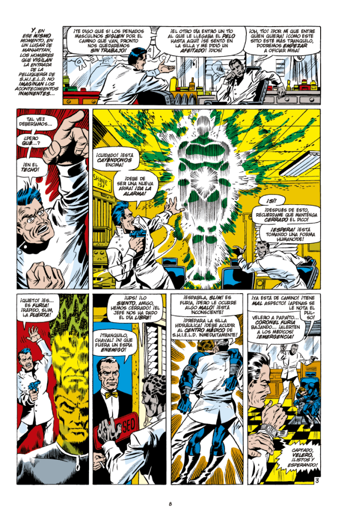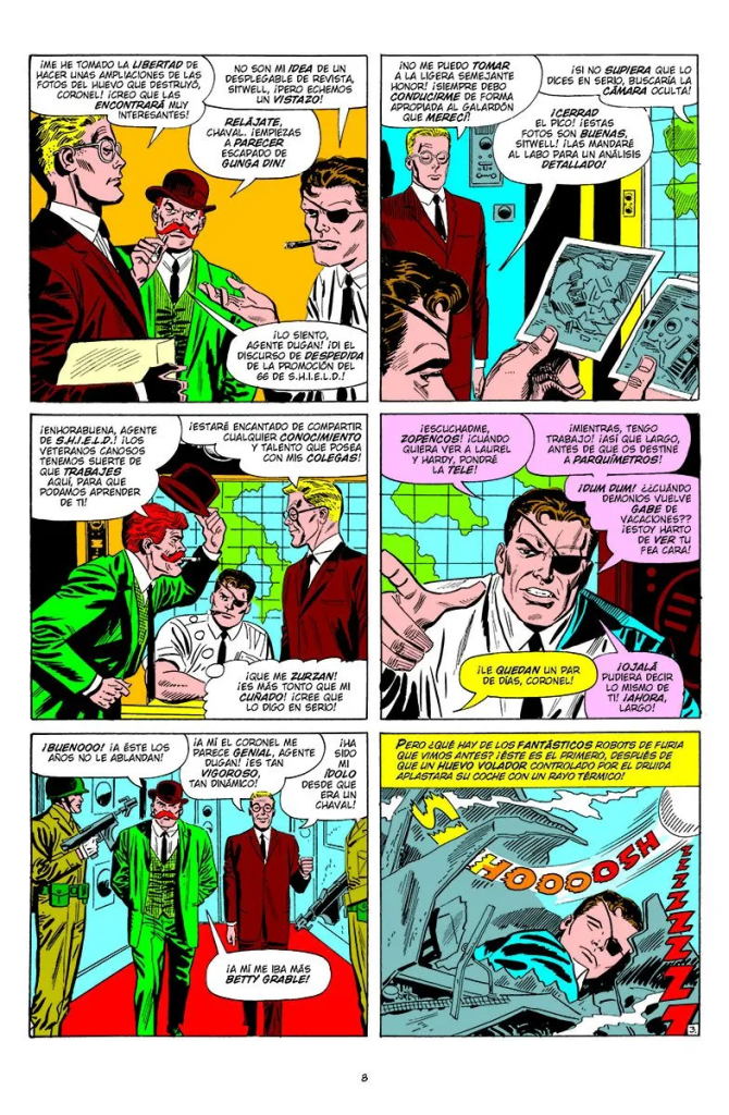 El número siete, de nuevo dibujado por Springer, es una historia de Archie Goodwin en la que plantea una historia en la que Furia es envenenado y tiene unas pocas horas de vida, lo que le hace alucinar y de esta forma se justifica la potente portada de Steranko de inspiración daliniana. El color de esta grapa es igualmente lamentable, pero me llama la atención que el dibujo de Springer no sea lo dinámico que resultó en las grapas anteriores, cuando se supone que dispuso más tiempo para dibujar estas páginas. No siendo mal comic para el standard de 1968, empezaba a quedar claro que el comic sin Steranko no era lo mismo.