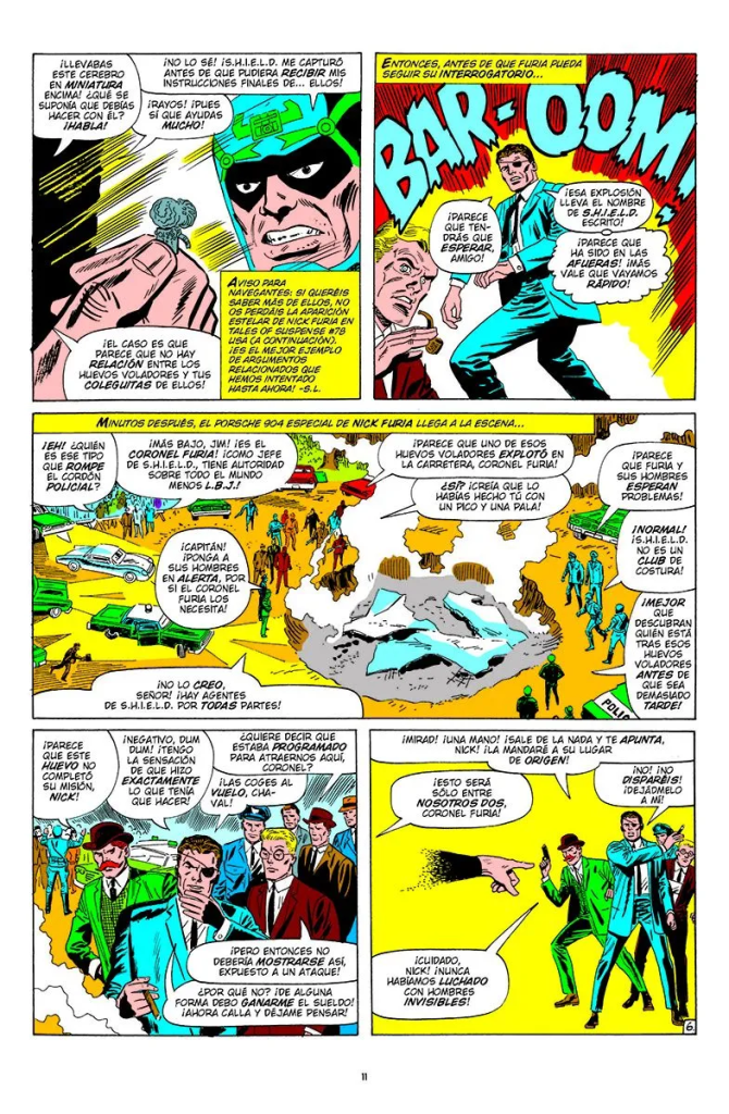 Steranko debió marcharse de forma super abrupta, porque Marvel se encontró con dos portadas sin historia. Stan Lee invitó diferentes personas del bullpen para que plantearan la historia que conectara con las potentes imágenes de Steranko. De forma que en el número 6 Roy Thomas plantea el argumento de una historia desarrollada por Archie Goodwin en el que Nick Furia se enfrentará con una raza alienígena que quiere destruir el planeta para poder volver a su dimensión. Una historia poco adecuada que no cada con el tono de espionaje hiper tecnológico que habiamos tenido hasta ese momento. En posotivo, la trama de Randall, el piloto de Shield que era sin saberlo un alien, que acaba sacrificándose para salvar a la Tierra, resulta satisfactoria.