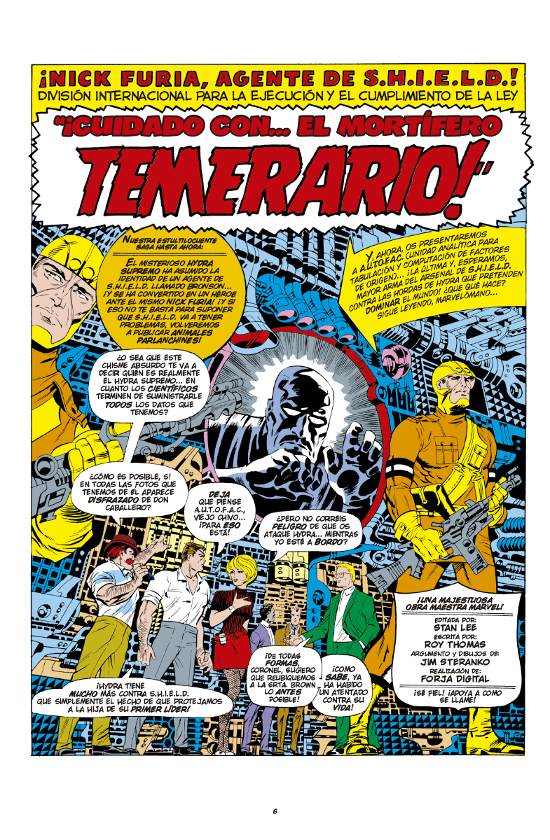 Steranko debió marcharse de forma super abrupta, porque Marvel se encontró con dos portadas sin historia. Stan Lee invitó diferentes personas del bullpen para que plantearan la historia que conectara con las potentes imágenes de Steranko. De forma que en el número 6 Roy Thomas plantea el argumento de una historia desarrollada por Archie Goodwin en el que Nick Furia se enfrentará con una raza alienígena que quiere destruir el planeta para poder volver a su dimensión. Una historia poco adecuada que no cada con el tono de espionaje hiper tecnológico que habiamos tenido hasta ese momento. En posotivo, la trama de Randall, el piloto de Shield que era sin saberlo un alien, que acaba sacrificándose para salvar a la Tierra, resulta satisfactoria.
