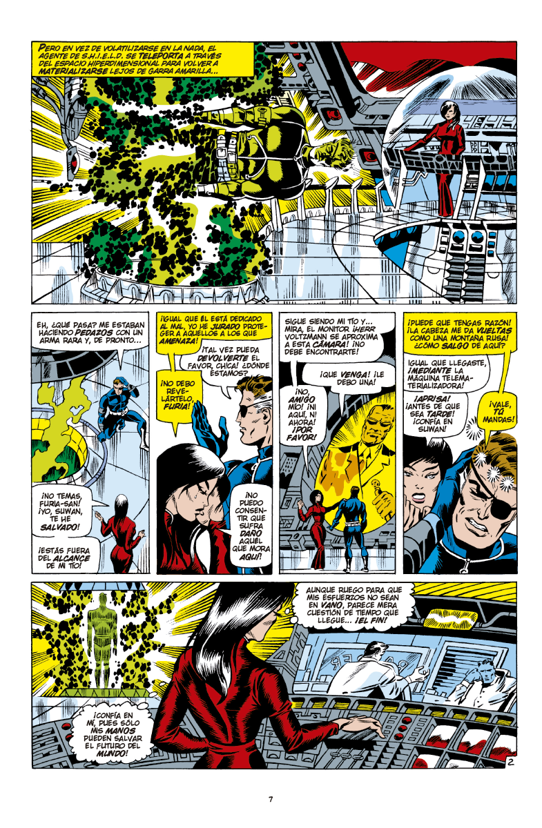 El número siete, de nuevo dibujado por Springer, es una historia de Archie Goodwin en la que plantea una historia en la que Furia es envenenado y tiene unas pocas horas de vida, lo que le hace alucinar y de esta forma se justifica la potente portada de Steranko de inspiración daliniana. El color de esta grapa es igualmente lamentable, pero me llama la atención que el dibujo de Springer no sea lo dinámico que resultó en las grapas anteriores, cuando se supone que dispuso más tiempo para dibujar estas páginas. No siendo mal comic para el standard de 1968, empezaba a quedar claro que el comic sin Steranko no era lo mismo.