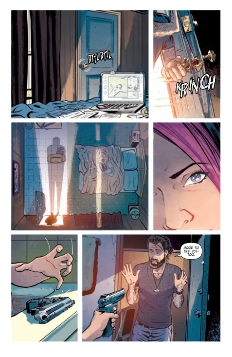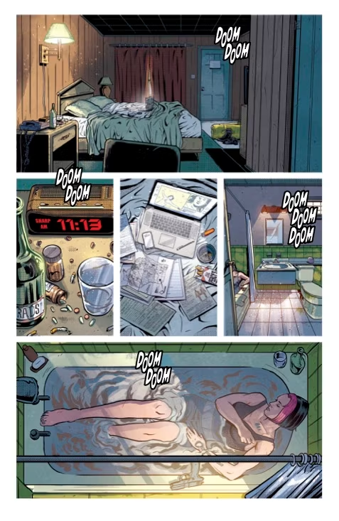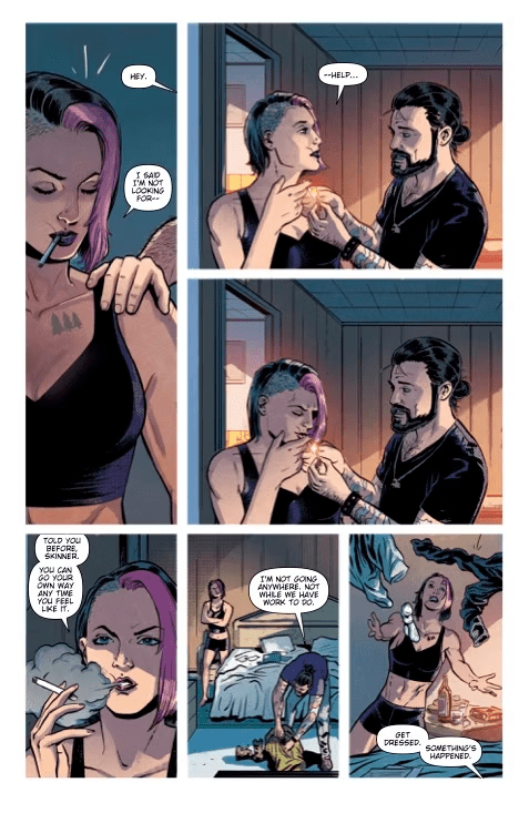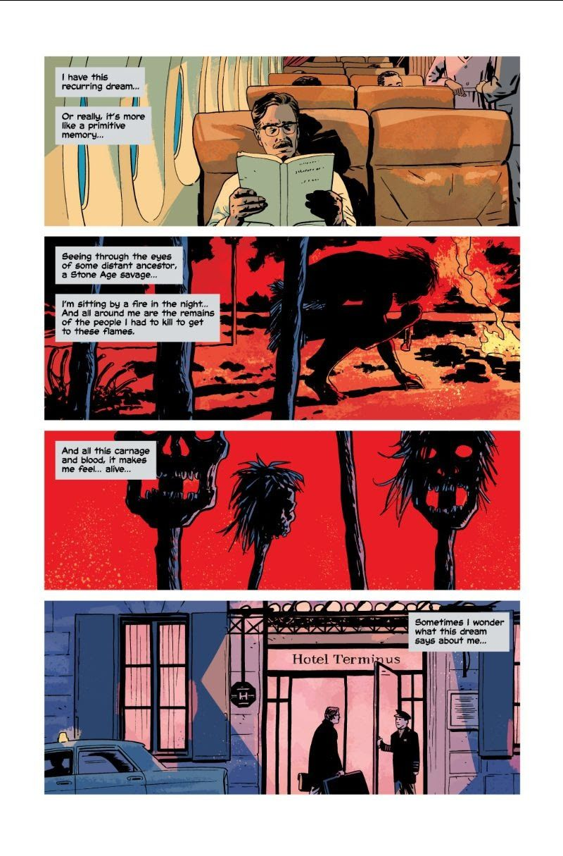 Condon plantea una historia muy correcta, con un potentísimo prólogo inicial, que podéis ver abajo, en el que asistiremos al primer ataque del asesino en Ambrose. A esto se añade la sorpresa de tener a Lu como protagonista de la historia al mismo nivel que el sheriff, que de alguna manera queda en un segundo plano a pesar de conocer a más detalles de su pasado reciente. Los seis números de esta serie se mueven entre las 22 y las 29 páginas, lo que me gusta bastante, dado que la serie avanza al ritmo que los autores desean, ofreciendo buenos cliffhangers y momentos impactantes.