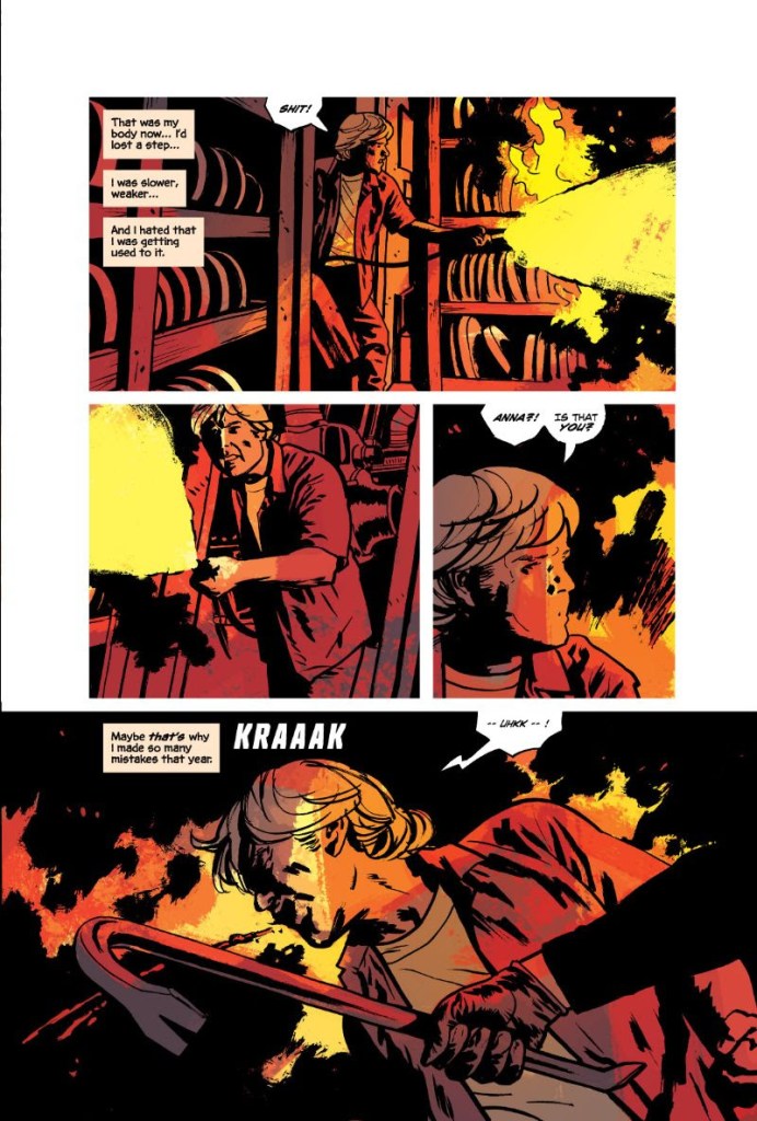 La historia se mueve de forma lógica a partir de la premisa y del conflicto interno del protagonista, planteando buenos giros a lo largo de las 100 páginas que tiene esta obra. Me parece interesante que en mi reseña de la última novela gráfica de Reckless comentaba que a Brubaker se le empezaban a ver las costuras narrativas al tener las cinco novelas gráficas la misma estructura, aunque luego cada historia fuera diferente. Night Fever le permite huir de esto y plantear una historia que empieza de forma pausada y va creciendo en tensión a medida que avanza, reafirmando la idea que viene bien plantear cosas diferentes y no estancarse en fórmulas que hayan sido exitosas en comics previos. Es cierto que no he conectado con la historia igual de bien que en otras obras previas de Brubaker, pero eso no es un problema de la historia o del ambiguo protagonista, sino que igual no tenía el cuerpo para este tipo de historia. Porque la verdad es que todo funciona como un reloj suizo.