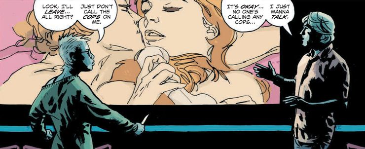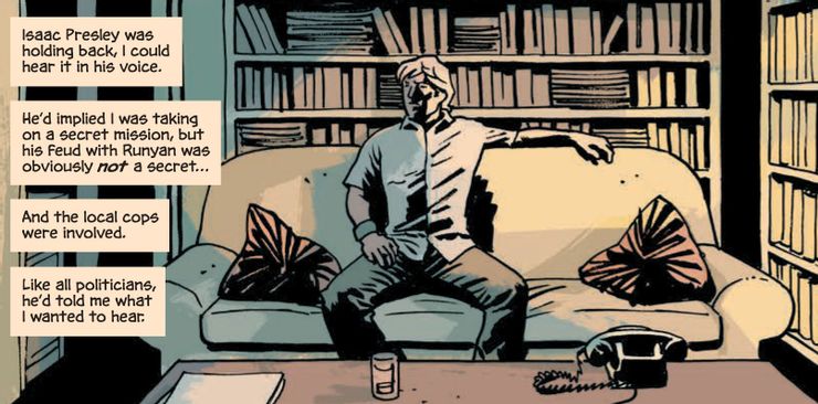 Y hablando de Sean Phillips, lo que está creando en la serie de Reckless es muy grande. Aparte de la perfecta narrativa y la caracterización de Ethan y Rachel, algo a lo que realmente ya estamos acostumbrados y damos por supuesto, un detalle que me ha flipado en esta obra y es la forma en que Phillips construye a Ethan a partir de su expresión corporal. Debido a su dificultad para sentir nada, es una persona que tiende a cerrarse en si mismo. Cuando investiga un caso su cuerpo está siempre en tensión como si estuviera a punto de estallar. Sólo con Anna (que no está físicamente presente en esta obra) cuando comparten veladas en su cine llega a relajarse y sentirse en paz siendo casi otra persona. Y esto es algo que veremos a medida que avanza la novela gráfica y él y Rachel se van conociendo y confiando el uno en el otro. Esta evolución no sólo se aprecia en las expresiones faciales sino especialmente en la expresión corporal, y me parece una pasada.
