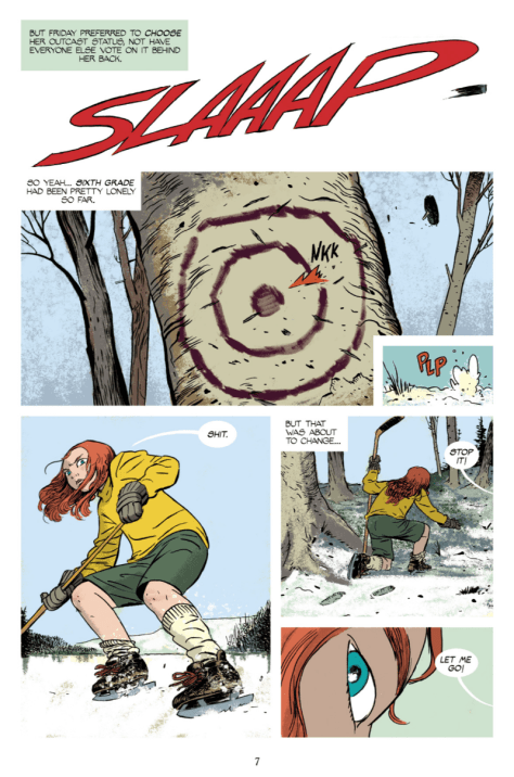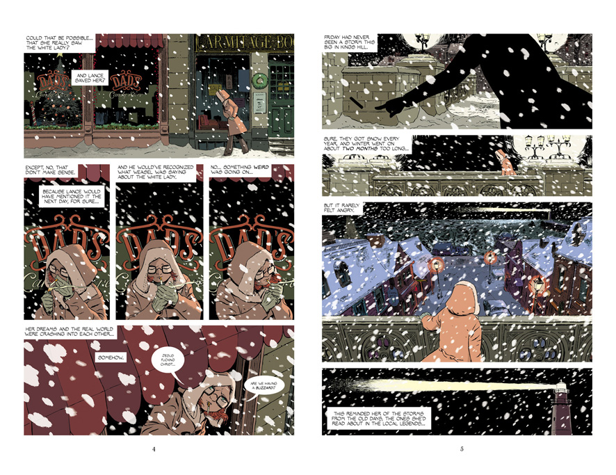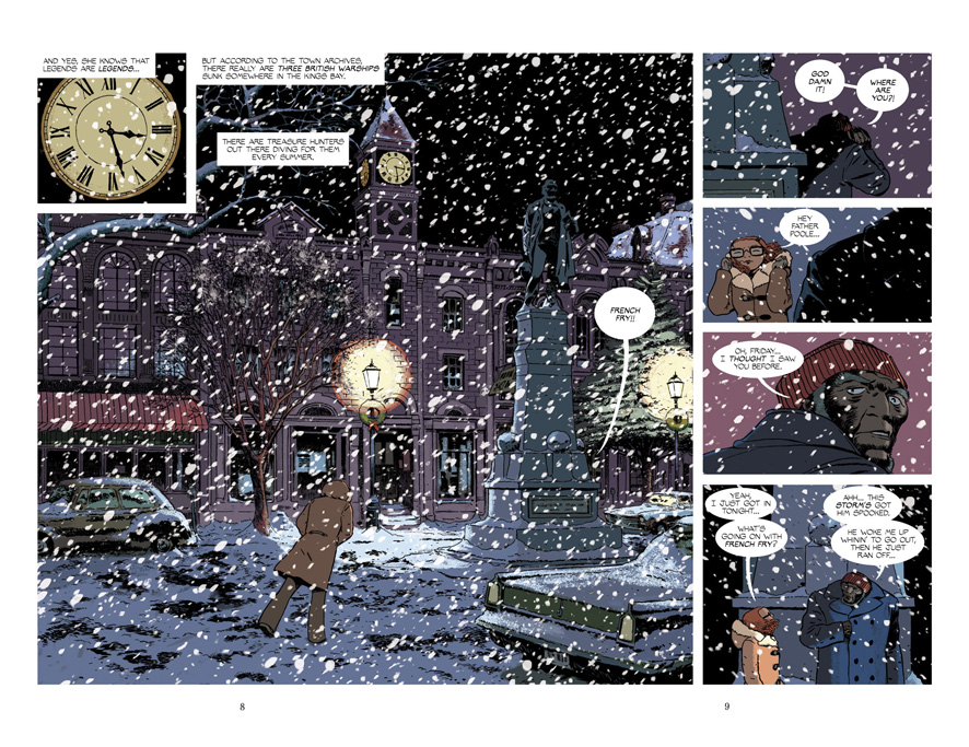 Parte importante del éxito del comic es también gracias al color de Muntsa Vicente, que transmite el elemento costumbrista de los pueblos pequeños en invierno cuando toca, para darle un giro estupendo a la paleta de color cuando aparece el elemento sobrenatural, resaltando el peligro y la amenaza hacia Friday y sus seres queridos. Como digo, es una pasada leer un comic en el que no necesitas los textos para entender lo que está pasando y que independientemente de la historia merezca la pena comprar este comic sólo por el dibujo. Martín y Vicente se encuentran en un estupendo momento de madurez creativa, consiguiendo que cualquier cosa que publiquen sea una compra obligada.