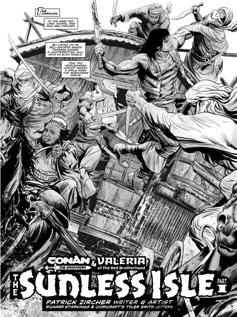 En lo referido a esta historia, The sunless isle (La isla sin Sol), tenemos a Conan y Valeria en una búsqueda de un tesoro para el Rey Asgalun que les llevará a una isla llena de peligros y monstruos terroríficos. Zircher dibuja a un Conan super canónico y poderoso que está genial, y su Valeria es una guerrera feroz que al mismo tiempo tiene una belleza y una potencia sexual bestial. Ambas caracterizaciones conectan perfectamente con el feeling que las historias de Robert E. Howard y se sienten correctas con lo que se espera en una historia de Conan. La aventura se lee en una sentada y me parece que es un éxito absoluto.