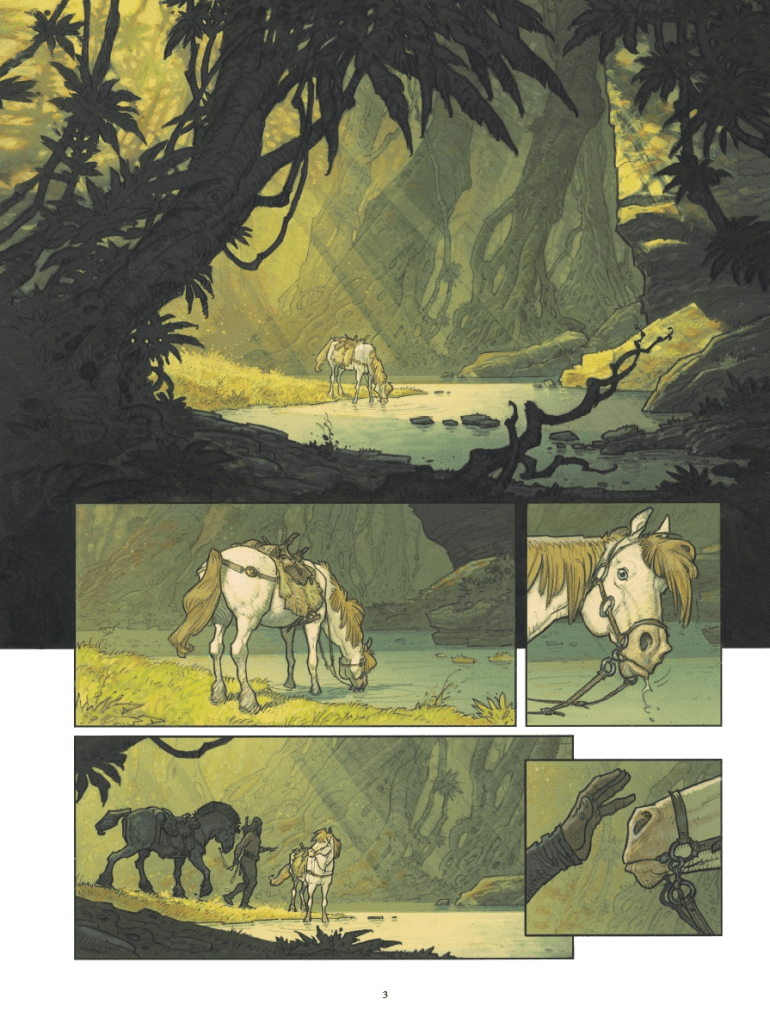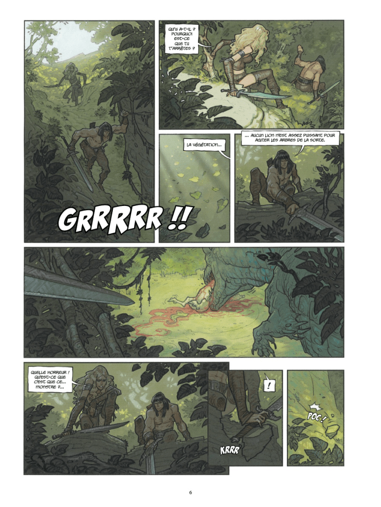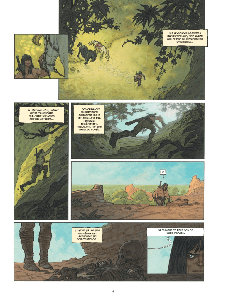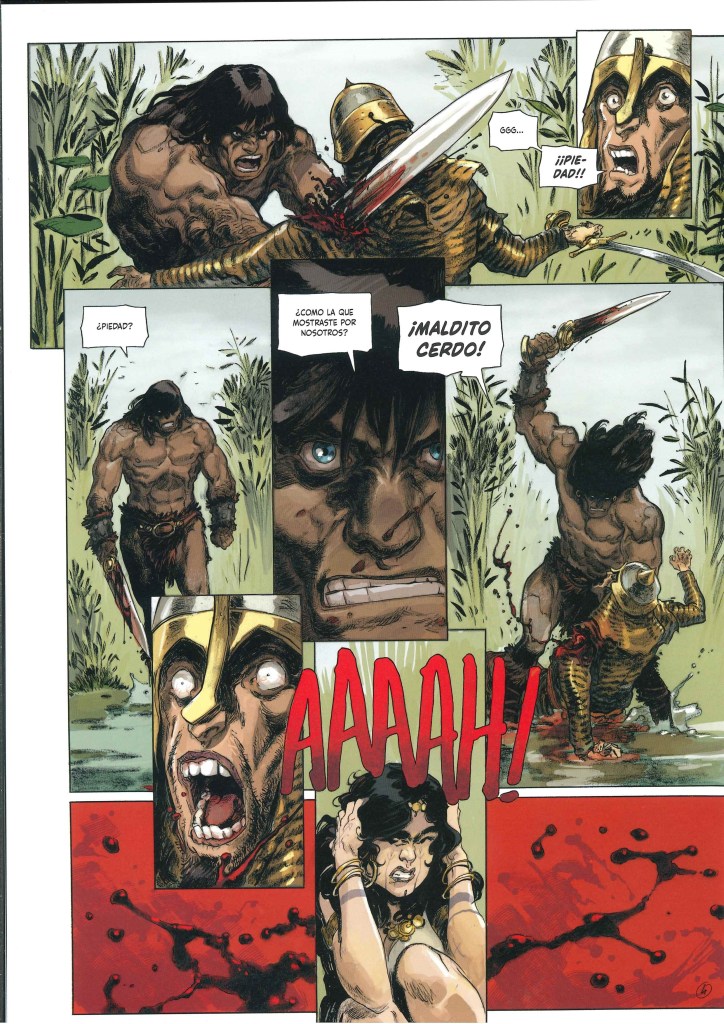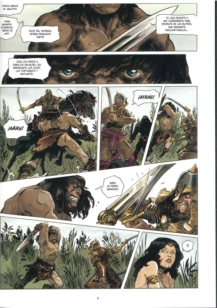 Para la adaptación de este relato de Howard al comic de la edición de Glénat, el guionista Sylvain Runberg plantea una narración con extensísimos bocadillos de texto que han hecho que tardara bastante en leerme el comic completamente. La historia se sitúa en un ubicación fronteriza con múltiples naciones y complejas relaciones político – militares, y se agradece la información. La prosa de Runberg añade lirismo a la historia, aunque no se si coge elementos literales de los textos originales. Además, me gusta la complejidad de personajes secundarios como la ayudante de Yasmina que se enamora de un hechicero al que convence para intentar gobernar ellos la nación. Con la cantidad de personajes y ejércitos enfrentados, me parece que esta historia de Howard es de las más interesantes y complejas que he leído en mucho tiempo.