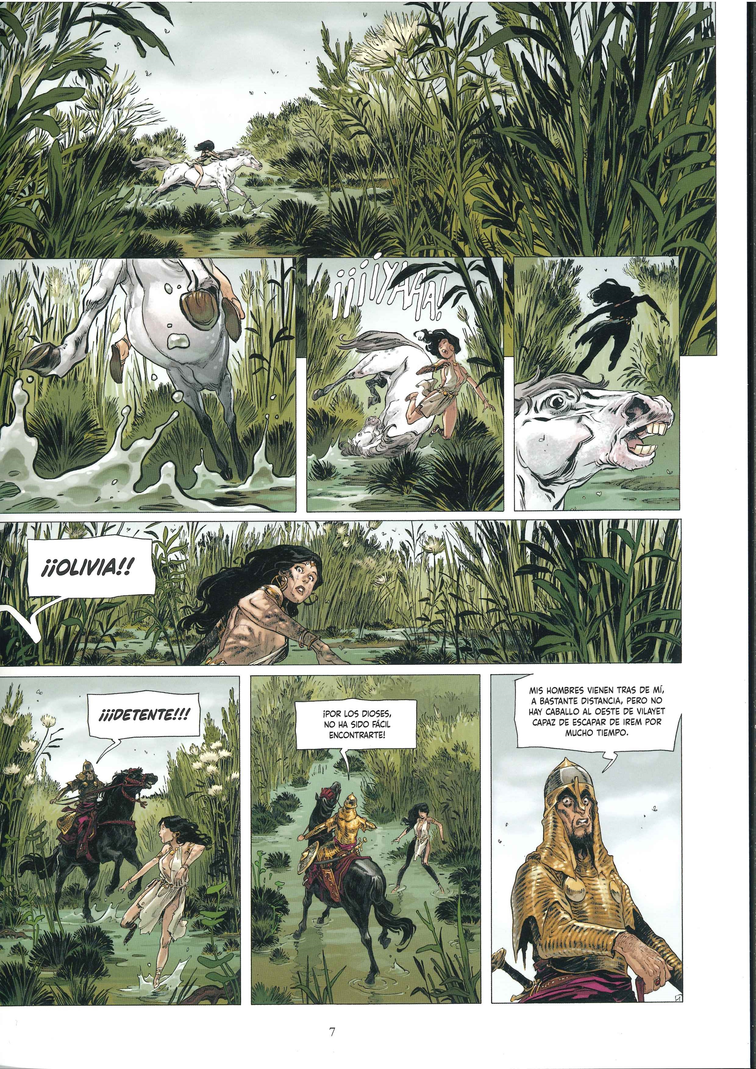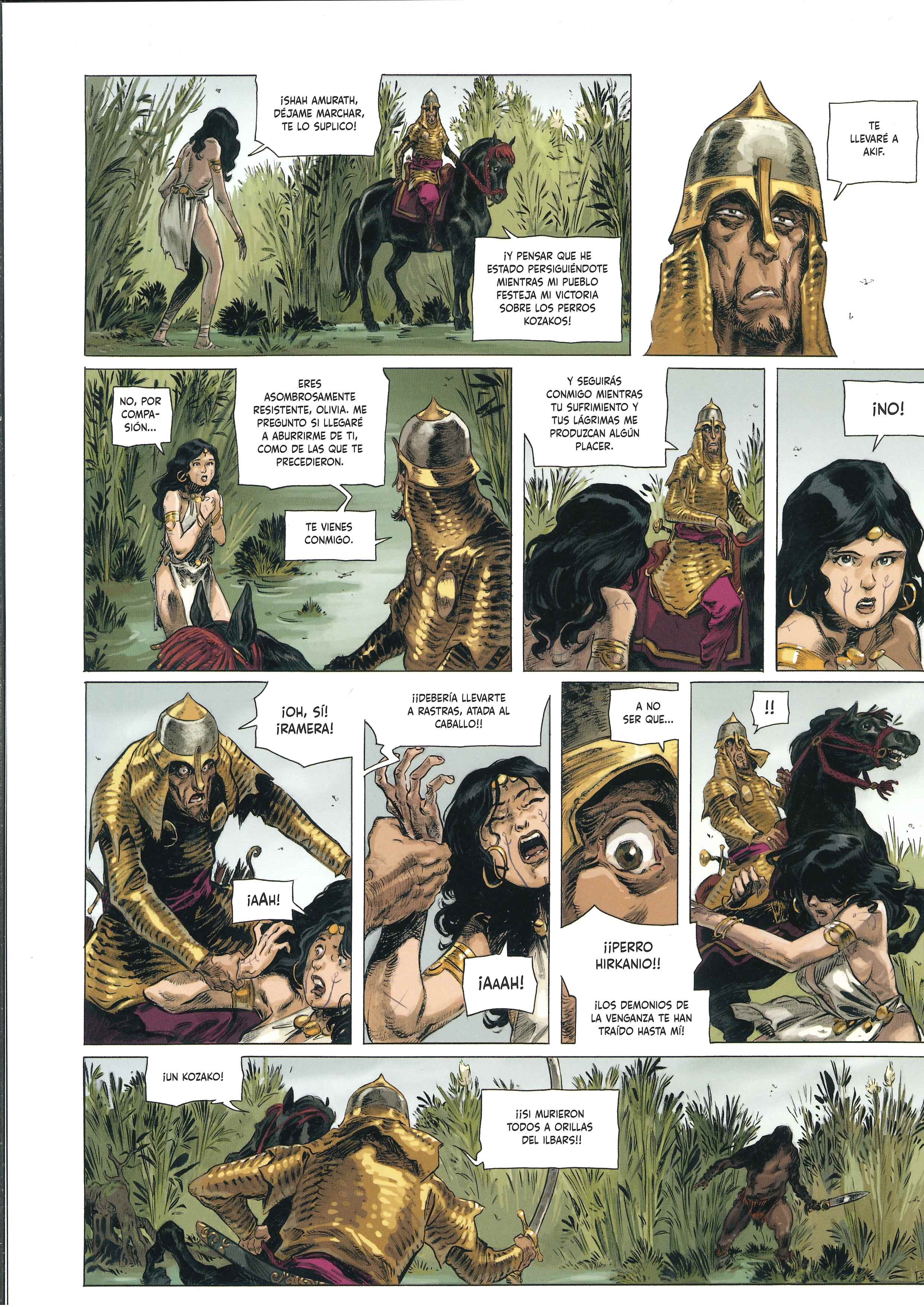 Para la adaptación de este relato de Howard al comic de la edición de Glénat, el guionista Sylvain Runberg plantea una narración con extensísimos bocadillos de texto que han hecho que tardara bastante en leerme el comic completamente. La historia se sitúa en un ubicación fronteriza con múltiples naciones y complejas relaciones político – militares, y se agradece la información. La prosa de Runberg añade lirismo a la historia, aunque no se si coge elementos literales de los textos originales. Además, me gusta la complejidad de personajes secundarios como la ayudante de Yasmina que se enamora de un hechicero al que convence para intentar gobernar ellos la nación. Con la cantidad de personajes y ejércitos enfrentados, me parece que esta historia de Howard es de las más interesantes y complejas que he leído en mucho tiempo.