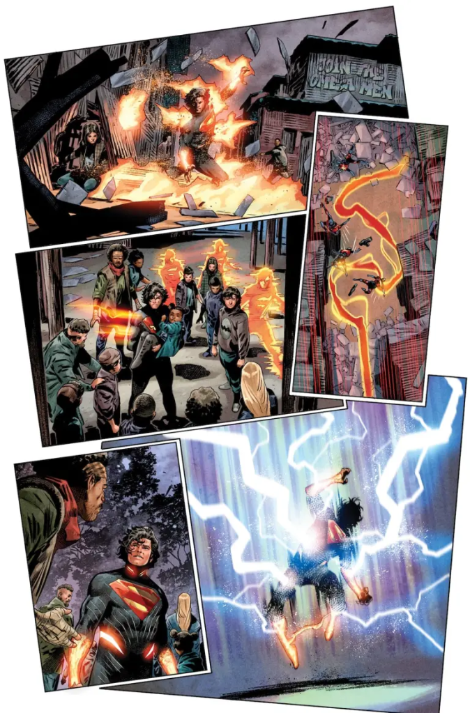 Aaron hace algo muy interesante que es hacer que otros personajes hablen de él, lo que le convierte en poco más que una leyenda urbana, una fuerza de la naturaleza. En la parte del pasado sus padres nos contaron que es un niño sensible un poco tímido que disfrutaba en la naturaleza y odiaba las ciudades y lo que ello suponía de deshumanización. La forma en que usa la escritura como medio de rebeldía frente a la educación normativa de las clases dirigentes de Krypton, es un detalle muy chulo de Aaron. Detalle que además se repite con la nueva Lois Lane, reforzando la idea de que la normalización que fuerzan las I.A.s dan un resultado super pernicioso para la sociedad humana. Me gusta la parte en que Kal-El dice que tiene miedo de encontrar al guardia que ha cometido una masacre porque tiene miedo de lo que le haría. Esto muestra la virtud moral que sabe que matar está mal aunque claramente tenga el poder de hacerlo sin que nadie pueda detenerle.