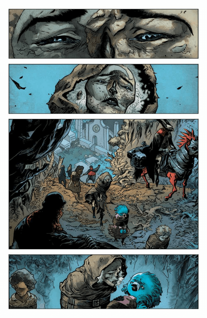 Sin embargo, en The Season Azaceta cambia completamente de registro, presentando un mundo luminoso con unas aventuras iniciales de la hermana pequeña de la familia Seasons que son ligeras y super divertidas. Esta aventura inicial es 100% Miyazaki gracias al dibujo de Azaceta, que es quien convierte en realidad la historia de Remender. En The Seasons también adquiere una importancia capital el color de Matheus Lopes, que plantea una paleta brillante para estas aventuras iniciales que cambia cuando el elemento malvado sobrenatural llega al pueblo de la niña. La capacidad de transmitir que estamos ante algo malsano es otro de los éxitos alucinantes de este comic.
