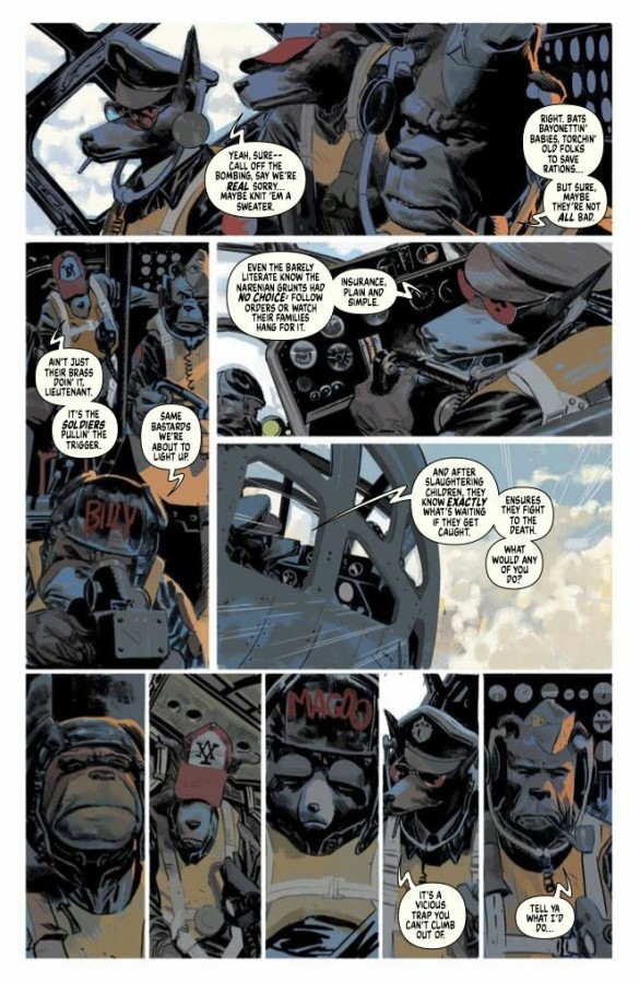 En primer éxito de Escape son las páginas pintadas de Daniel Acuña, que está a un nivel estratosférico. Está claro que Acuña no es el primero en hacer historias con animales antropomórficos (¿verdad, Blacksad?), pero este recurso lleva utilizándose desde siempre en animación. Según Remender, la idea de estos animales antropomórficos es que sea más fácil empatizar con todos los personajes, aunque sean los malos. El trabajo de caracterización de Acuña me parece maravilloso, como lo es también el diseño de los aviones que vemos en este primer número, que recuerdan completamente a los aviones reales de la 2ª Guerra Mundial. Cada una de las imágenes tiene una personalidad bestial y consigue que este mundo te atrape desde la primera viñeta.