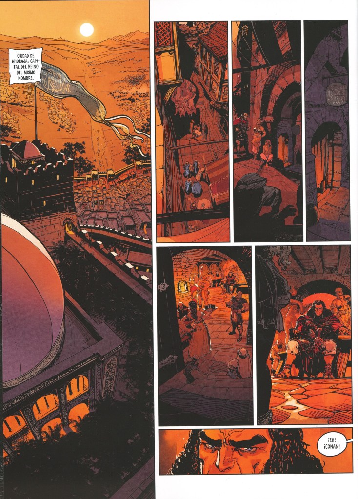 Lo primero que me ha llamado la atención es la imagen que Ronan Toulhoat nos ofrece de Conan, muy alejada de la versión icónica de Frank Frazetta o John Buscema pero más cerca de lo que posiblemente Howard imaginara para el personaje, con un pelo largo rizado que recordaría a un celta o un escocés, y con una cota de malla y capa carmesí. Y aunque reconozco que este cambio que me ha chocado y me ha costado acostumbrarme a él, la verdad es que el dibujo de Toulhoat me ha flipado. Aparte del diseño de personajes, me encanta la narrativa que muestra en la batalla, mostrando perfectamente el avance de las diferentes fuerzas resaltando la escala de la batalla que está teniendo lugar, y el salvajismo que se encuentra Conan en el dentro del combate. Me ha llamado además la atención el uso predominante del color color como gama cromática elegida por Toulhoat para contar esta historia. En resumen, la verdad es que el dibujo de este álbum me ha gustado mucho, mucho, la verdad.