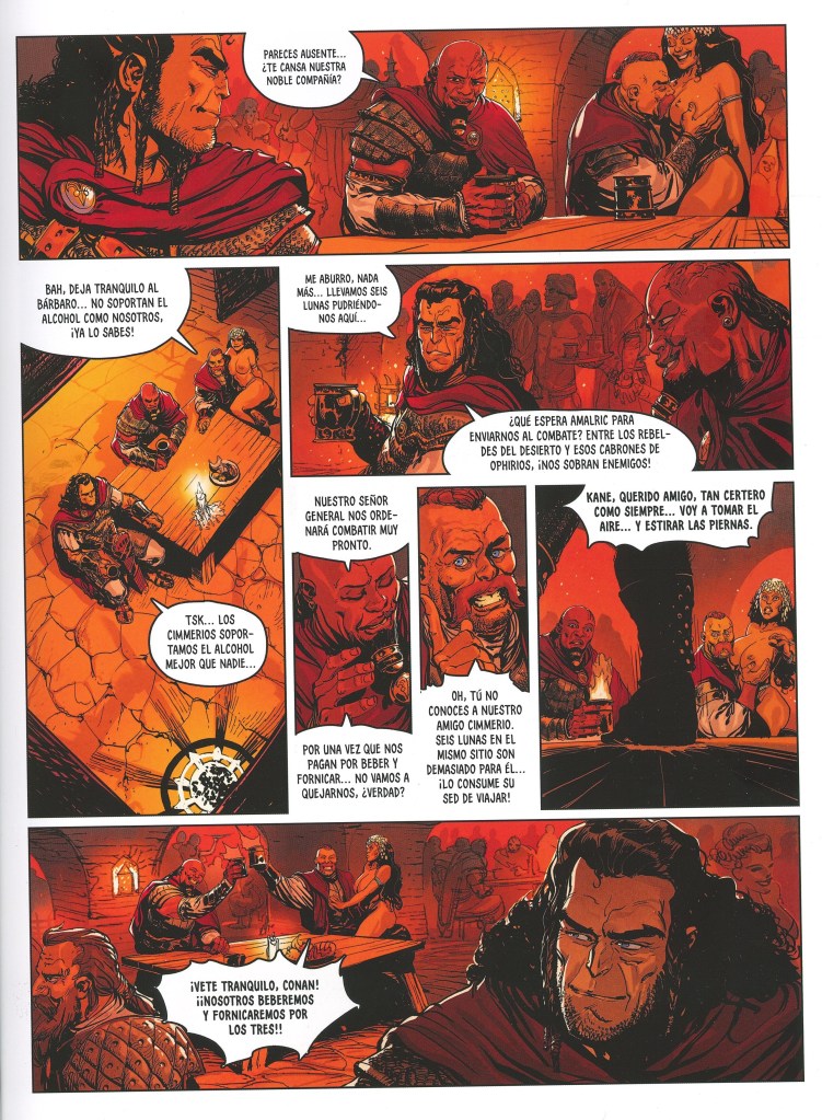 Junto al dibujo perfecto, la historia de El coloso negro, adaptada por Vincent Brugeas me ha gustado mucho también. Las típicas historias de Conan suelen girar en torno a un vagabundo que se encuentra en unas ruinas de una ciudad perdida un tesoro y un monstruo, quedándose además con una joven ligera de ropa al final de la historia. Y aunque en este tomo también hay mujeres ligeras de ropa y un tesoro en una ciudad perdida, Howard planteó esta historia casi como una novela histórica planteada para contarnos el desarrollo de una batalla que tuvo lugar en la actualidad. Frente al Conan ladrón y forajido aquí le tenemos en una versión de general de los ejércitos de Khoraja, teniendo que motivar a sus hombres para la batalla. Junto a esto, la princesa Yasmela es muy diferente de la salvaje Bêlit que conocimos en el volumen anterior, y aunque Conan al final debe salvarla del mago malvado, ofrece una versión femenina interesante que no es un estereotipo sexualizado vacío.