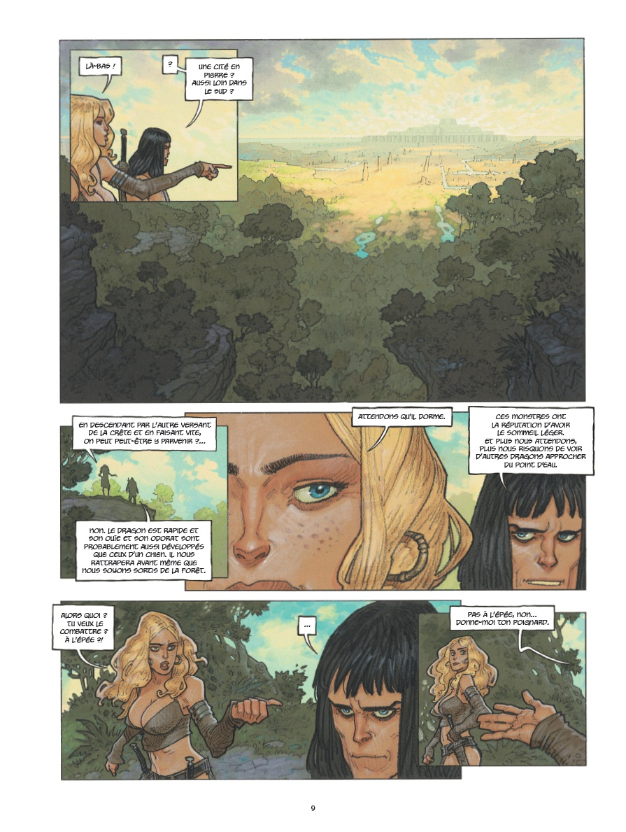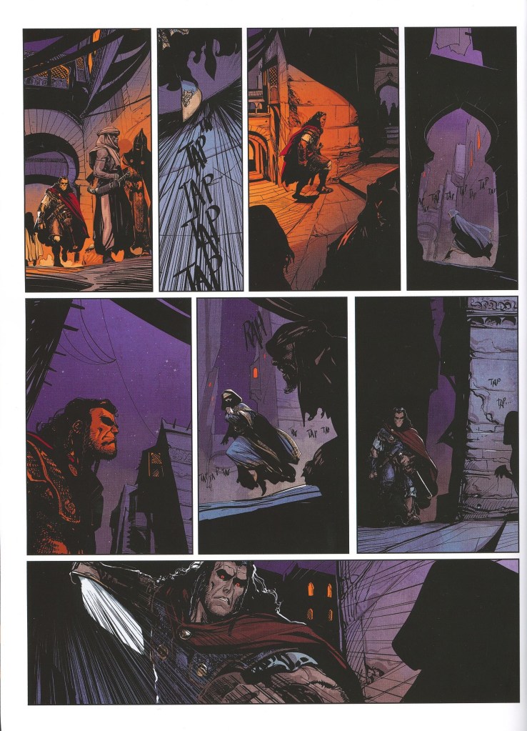 Para la adaptación de este relato de Howard al comic de la edición de Glénat, el guionista Sylvain Runberg plantea una narración con extensísimos bocadillos de texto que han hecho que tardara bastante en leerme el comic completamente. La historia se sitúa en un ubicación fronteriza con múltiples naciones y complejas relaciones político – militares, y se agradece la información. La prosa de Runberg añade lirismo a la historia, aunque no se si coge elementos literales de los textos originales. Además, me gusta la complejidad de personajes secundarios como la ayudante de Yasmina que se enamora de un hechicero al que convence para intentar gobernar ellos la nación. Con la cantidad de personajes y ejércitos enfrentados, me parece que esta historia de Howard es de las más interesantes y complejas que he leído en mucho tiempo.