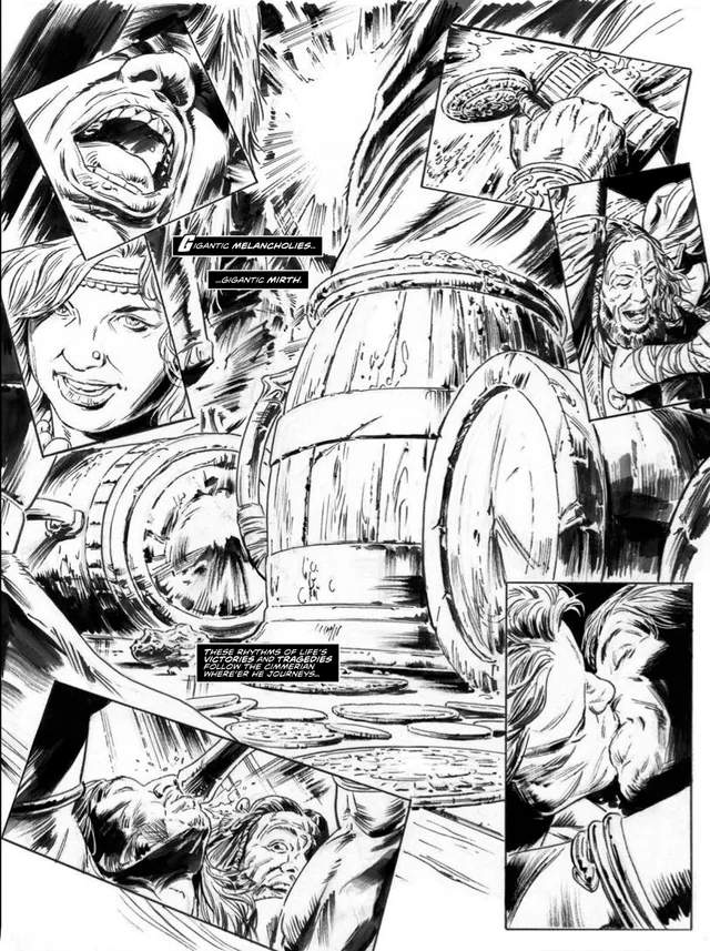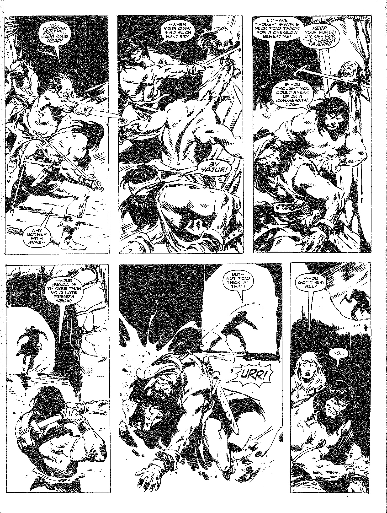Por último, Zub recupera a otro de los personajes menos conocidos de Howard, el marino Steve Costigan, en una historia con dibujo de Roberto de la Torre. En The snakeskin shuffle (cambio de piel se serpiente), este personaje se meterá en líos al intentar ayudar a una bella mujer que tiene problemas al serle robado un objeto de gran valor. Costigan y su perro se meten en líos cada vez que bajan a tierra firme y esta vez no será diferente, pero lo que no contaba era que el objeto que quiere recuperar tiene peligrosas cualidades mágicas. El dibujo Roberto de de la Torre transmite un tono de humor para un personaje que parece que vive en los bares portuarios donde el alcohol hace que se meta en líos. La historia de 10 páginas da para lo que da, pero me parece un estupendo complemento para este número de La espada salvaje de Conan.