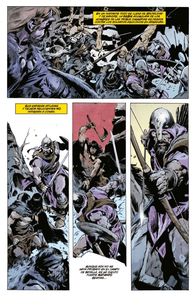 Empezando por el guion, me gusta especialmente que Jim Zub plantea una historia totalmente nueva que NO es la enésima adaptación de un relato de Robert E. Howard. Dentro de esta novedad, el gran éxito del comic es que tenga un ADN 100% Conan que te sumerge desde el primer momento en la historia y te hace sentir que estas leyendo un comic con el feeling, el tono y la temática que debe tener una historia de Conan. Además, me gusta también que la acción empiece con un Conan ya adulto y no se pierda tiempo en contar un origen que todos los que compramos este comic ya lo conocemos. La horda de seres casi zombies que están arrasando con los pueblos de la frontera plantea una amenaza a la altura de este reinicio de las aventuras de Conan en el comic, siendo una marea ante la que incluso Conan se muestra indefenso. El origen de esta horda y del brujo que la controla plantea una amenaza sobrenatural que no puede ser más Conan, asentando la sensación de familiaridad en el buen sentido que tiene este comic.