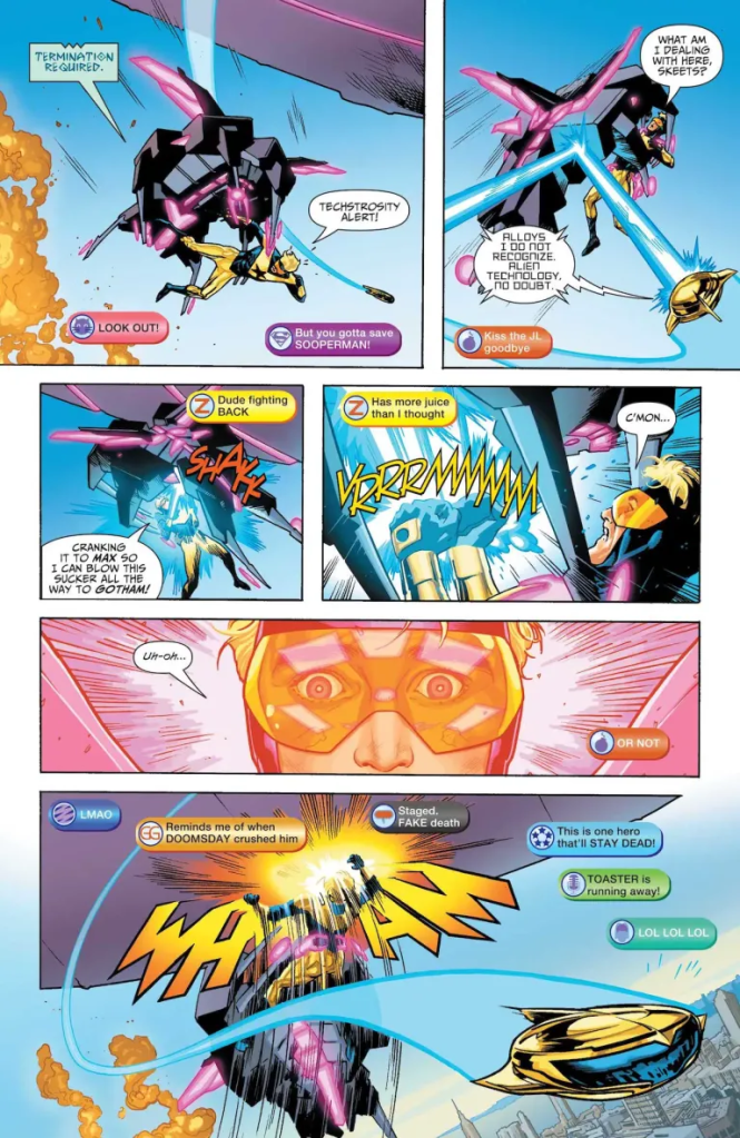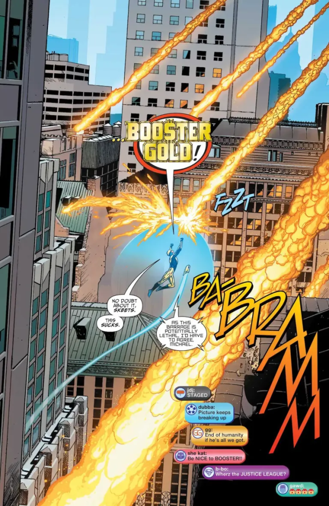 Blue y Gold ofrece una aventura ligera centrada en mostrar a estos dos perdedores y como a pesar de todo siguen intentando hacer lo correcto, aunque para ello tengan que abrir campañas de micromecenazgo para mantener su actividad. El contraste del Booster super pagado de si mismo con el depresivo Beetle tras ser despedido de su empresa genera una dinámica super chula durante toda la serie. En este sentido, usar los comentarios de redes sociales a los videos de Booster añade un toque super divertido que ayuda a construir el tono ligero de la historia.