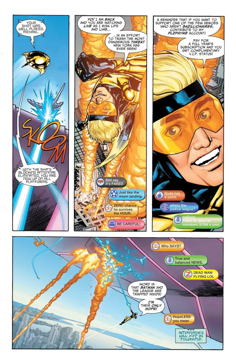 Blue y Gold ofrece una aventura ligera centrada en mostrar a estos dos perdedores y como a pesar de todo siguen intentando hacer lo correcto, aunque para ello tengan que abrir campañas de micromecenazgo para mantener su actividad. El contraste del Booster super pagado de si mismo con el depresivo Beetle tras ser despedido de su empresa genera una dinámica super chula durante toda la serie. En este sentido, usar los comentarios de redes sociales a los videos de Booster añade un toque super divertido que ayuda a construir el tono ligero de la historia.