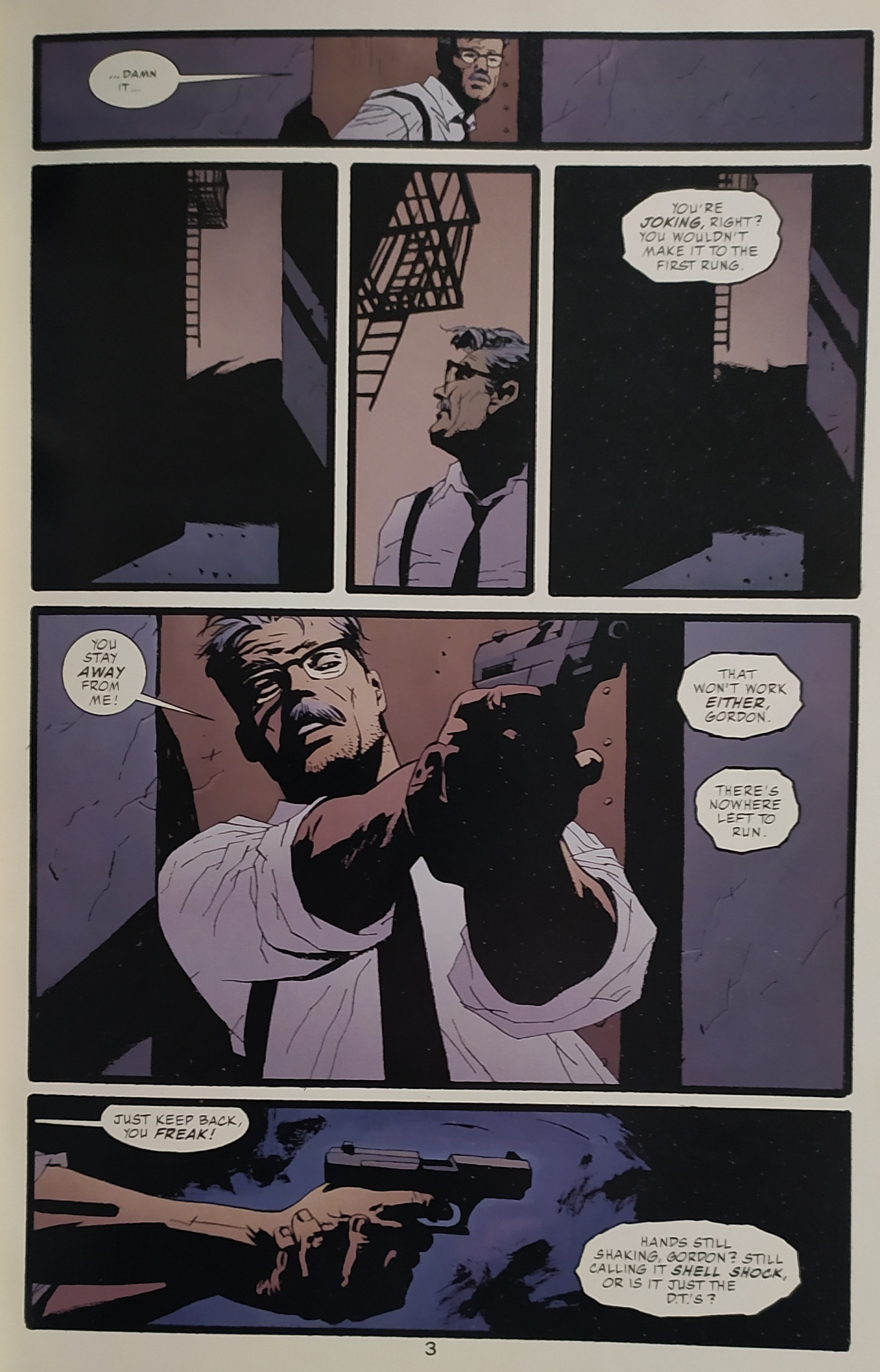 En este sentido, quizá el hallazgo más interesante de su historia es que Gordon volviera de la 2ª Guerra Mundial traumatizado por el horror de la guerra, donde además conoció al joven pacifista Bruce Wayne. Frente a la imagen heroica que los Estados Unidos quiso transmitir de la guerra, algo que de hecho no cambió hasta Vietnam, Brubaker añade este detalle que posiblemente viniera de las historias que su padre militar o su abuelo escritor debieron contarle cuando era niño.