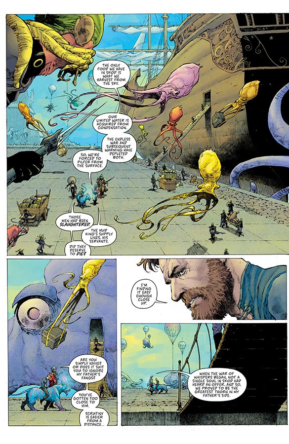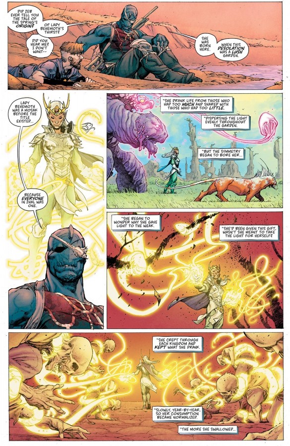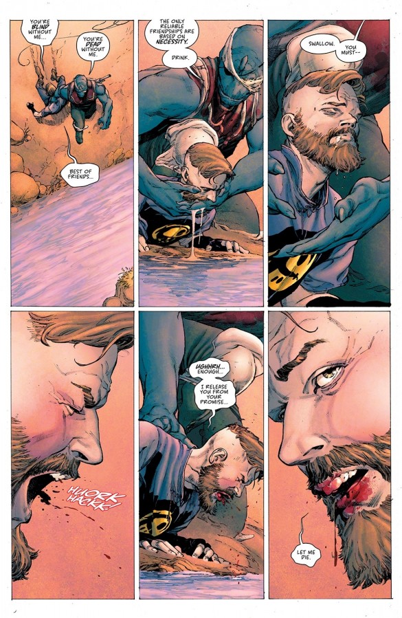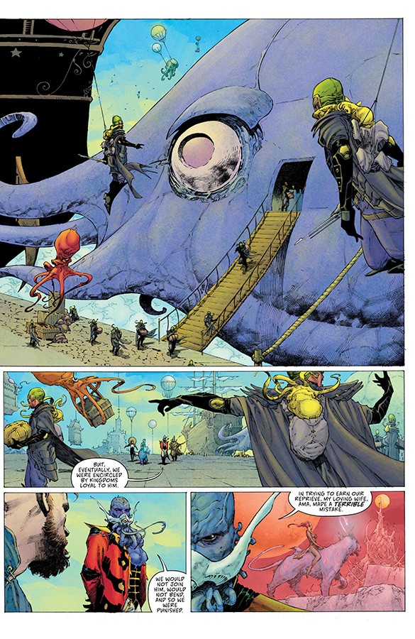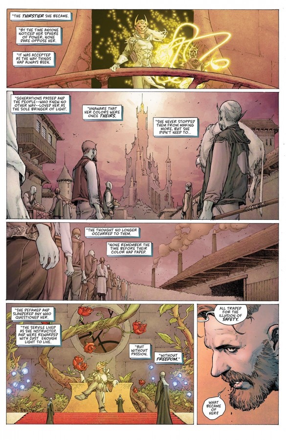 Pero peor que es eso es la comprobación que en lugar de la historia de fantasía épica que Remender prometió al inicio de la serie, Seven to eternity ha sido un peñazo moralizante que nos ha traído al Remender más nihilista y desolador. Remender más que nunca transmite su enfado ante nuestra civilización occidental que para él está perdida al estar habitada por dos tipos de personas: los seres grises que se (nos) conforman con las migajas que nos dan las grandes corporaciones que ostentan el poder real, y peor, los que dicen ser salvadores de la patria que no son más que seres egoístas que traicionarán a quien sea para conseguir el poder, mientras nos dicen que todo lo hacen «por nuestro bien». Y frente a estas dos realidades, los pocos héroes verdaderos son apenas hormigas que intentan parar el desbordamiento de un río con palitos y están abocados al fracaso. Joer, se por entrevistas que Remender lo pasó más de joven, pero no hay duda que el pobre tiene un montón de traumas y demonios que intenta exorcizar mediante los comics. Y siendo loable este empeño, la verdad es que en otros comics lo ha hecho con historias al menos entretenidas, cosa que no ha conseguido en este comic.