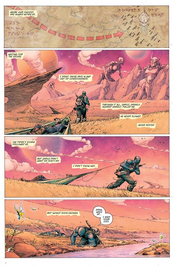 La verdad es que vine pensando que Seven to eternity iba a ser el típico viaje del héroe, y no tuve problema cuando me di cuenta que muy probablemente estábamos ante un fall-from-grace. Sin embargo, descubrir lo que es realmente el comic y quien es Adam en realidad, que no voy a decir para no chafárselo a nadie que esté esperando que se publique en España, ha sido un bajón super desolador. Y el caso es que había ideas interesante en el comic, como la realidad que a veces nos engañamos a nosotros mismos para justificar lo injustificable, materializando el clásico «el camino al infierno está construido de buenas intenciones». Pero en el caso de este comic, la ejecución de Remender de estas ideas no puede ser más fallida.