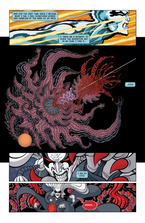 Sin embargo, la propia premisa y la naturaleza cíclica de los comics de superhéroes provocaba que el final estaba marcado de antemano. Norrin tenía que volver al presente de alguna forma y NO podía matar a Knull dado que le tenemos actualmente en las páginas de Veneno. La forma en que Cates cierra la historia me ha gustado mucho y además de psicodelia, transmite poesía y belleza, algo muy complicado de conseguir y cuyo triunfo convierte este comic en más inesperado si cabe.