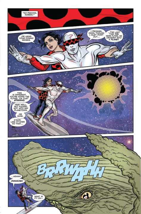 Aunque han visitado la Tierra en varias ocasiones para que Dawn siga conectada con su familia, sus viajes les han hecho visitar todo tipo de planetas poblados por culturas extrañas e imaginativas, provocando situaciones de lo más variopintas. La dinámica de las historias de Slott giran en torno a estos viajes y dan rienda suelta para que Mike Allred cree algunas de las mejores páginas de su carrera, gracias a los extraños aliens y situaciones en las que se verán involucrados nuestros protagonistas.