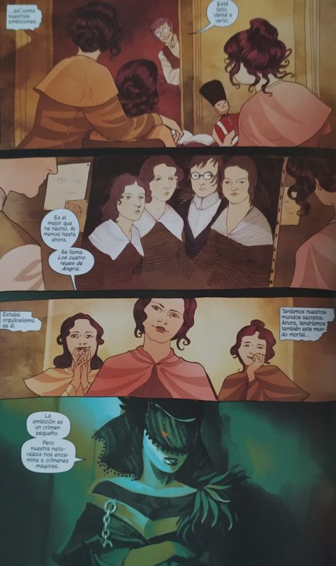 Gillen está planteando Die además de para jugar con los arquetipos de los juegos de rol, en muchos casos para darles la vuelta, para rendir homenaje a los que él considera que son los padres (aunque sea a nivel de inspiración) de los juegos de rol. Si en el primer tomo Tolkien nos sorprendió con su presencia y en el segundo conocimos la historia de la familia Brönte, en este tercer tomo hay un nuevo invitado que me voló la cabeza. Este padre de la ciencia ficción moderna cuyo nombre no revelaré por si alguien no ha leído este tomo, es utilizado por Gillen para lanzarnos un pegote expositivo que le permita explicar la realidad (y el giro) de mundo de 20 caras donde los protagonistas viven sus aventuras. Y aunque en parte la sorpresa de la propia identidad del personaje y su conexión con los juegos de rol molan, realmente este tercer número sufre por el exceso expositivo y porque se nota que la función del personaje es precisamente esa.