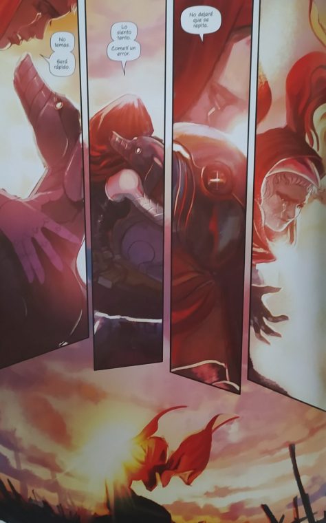 Stephanie Hans me parece una ilustradora increíble y sus imágenes me transmiten una tremenda expresividad, sobre todo con la utilización del color en cada escena. Pero ahora que me he leído los tres volúmenes de un tirón, parece como si estuviera sufriendo una involución mientras dibuja (pinta) Die, porque me da la sensación que cuenta cada vez peor la historia, con una nula fluidez narrativa a todos los niveles, entre viñetas y en si entre las diferentes páginas. No tengo claro si fue por los plazos de entrega o si hay un motivo concreto, pero la cosa va a peor con cada número. Y es una pena, porque como ilustradora ya digo que me parece brillante, pero esto resalta lo difícil que es contar una historia y cómo no es suficiente con dibujar bonito o saber crear momentos icónicos para ser una buena dibujante de comics.