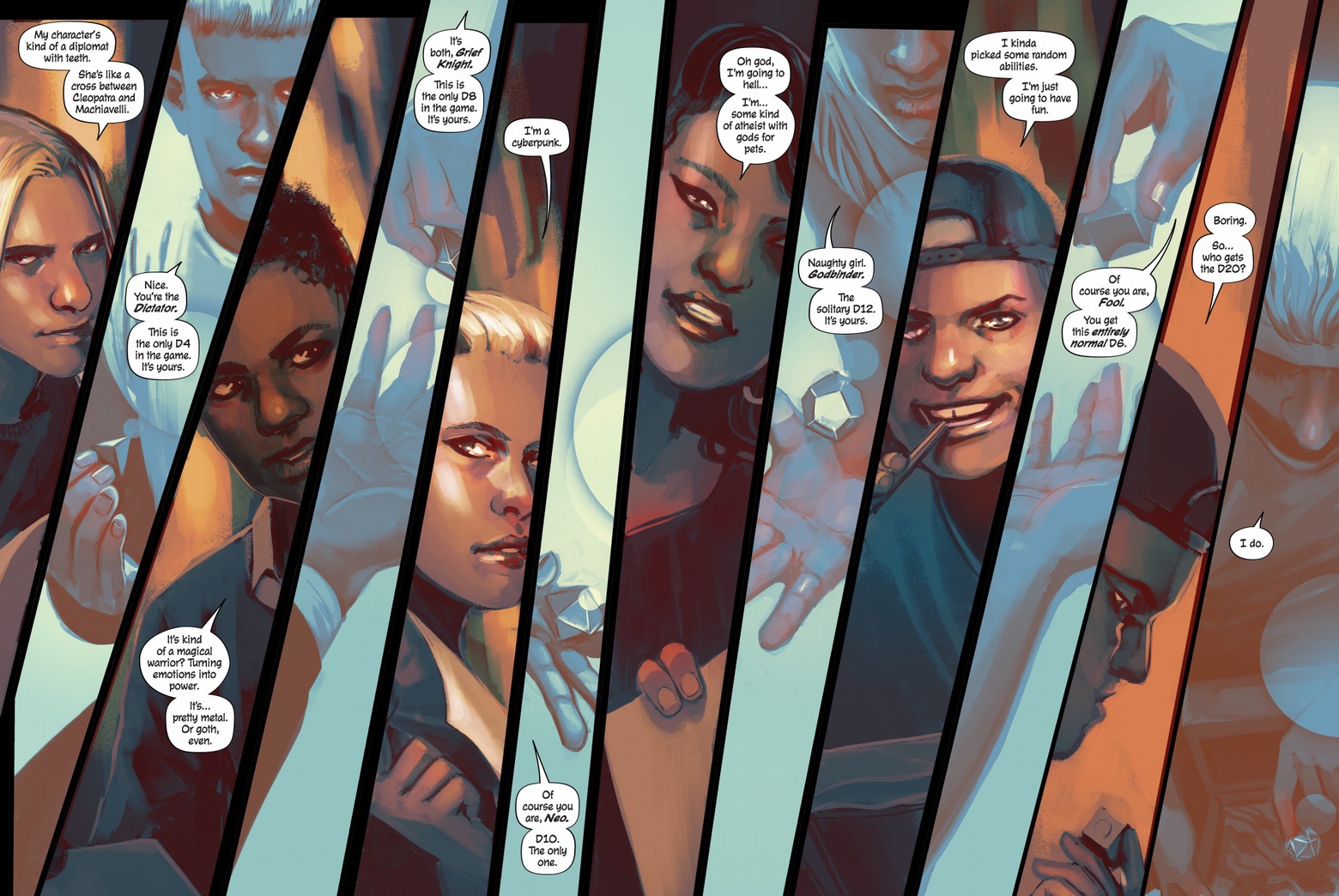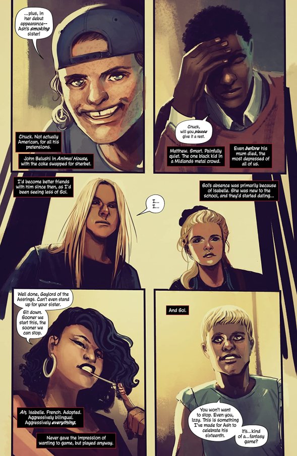 En lo relativo a los protagonistas, hay que reconocer que Gillen se esfuerza en convertirles en seres complejos con defectos y problemas a los que deben sobreponerse si quieren volver a la Tierra. La complejidad de sus caracterizaciones me parecen dignas de elogio y me parece genial que alguno de ellos se comporten como el villano de la función, pero debo de reconocer que a pesar de todo no he logrado empatizar con ninguno, lo cual al final acaba siendo un problema. En este sentido, siento que al no haber sido jugador de rol me estoy perdiendo una parte fundamental del subtexto del arquetipo que representan, cosa que también me da una sensación decepcionante, al no triunfar los personajes como esperaba dentro de la experiencia lectora.