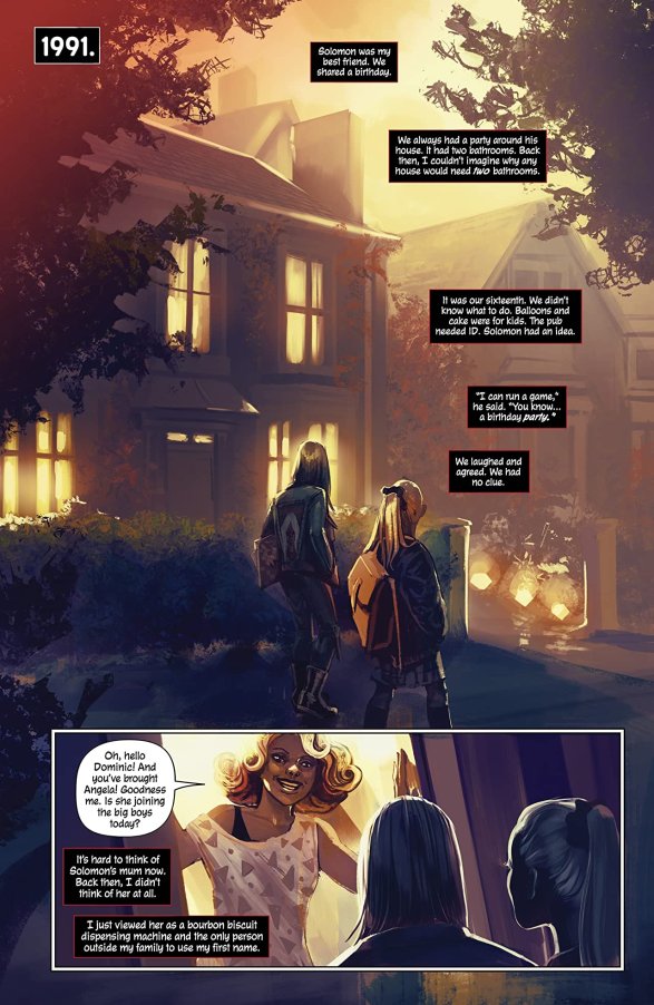 Gillen está planteando Die además de para jugar con los arquetipos de los juegos de rol, en muchos casos para darles la vuelta, para rendir homenaje a los que él considera que son los padres (aunque sea a nivel de inspiración) de los juegos de rol. Si en el primer tomo Tolkien nos sorprendió con su presencia y en el segundo conocimos la historia de la familia Brönte, en este tercer tomo hay un nuevo invitado que me voló la cabeza. Este padre de la ciencia ficción moderna cuyo nombre no revelaré por si alguien no ha leído este tomo, es utilizado por Gillen para lanzarnos un pegote expositivo que le permita explicar la realidad (y el giro) de mundo de 20 caras donde los protagonistas viven sus aventuras. Y aunque en parte la sorpresa de la propia identidad del personaje y su conexión con los juegos de rol molan, realmente este tercer número sufre por el exceso expositivo y porque se nota que la función del personaje es precisamente esa.