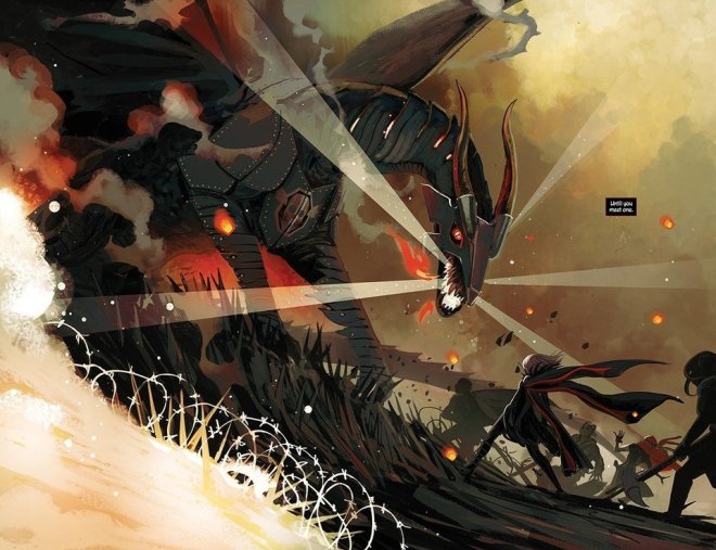 Stephanie Hans me parece una ilustradora increíble y sus imágenes me transmiten una tremenda expresividad, sobre todo con la utilización del color en cada escena. Pero ahora que me he leído los tres volúmenes de un tirón, parece como si estuviera sufriendo una involución mientras dibuja (pinta) Die, porque me da la sensación que cuenta cada vez peor la historia, con una nula fluidez narrativa a todos los niveles, entre viñetas y en si entre las diferentes páginas. No tengo claro si fue por los plazos de entrega o si hay un motivo concreto, pero la cosa va a peor con cada número. Y es una pena, porque como ilustradora ya digo que me parece brillante, pero esto resalta lo difícil que es contar una historia y cómo no es suficiente con dibujar bonito o saber crear momentos icónicos para ser una buena dibujante de comics.