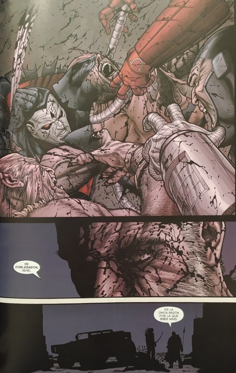 Unido a esta falta de elementos icónicos, no se si por el hecho de entintarse a si mismo o por el exceso de hiper violencia, pero las páginas de McNiven con color de Dave McCaig lucen «sucias», por calificarlo de alguna manera. Y ojo que la ultraviolencia en las escenas de acción es genial y me encanta, no tengo problema con que un comic incluya elementos gores. Pero la lectura de este comic me deja la sensación que no por intentar ser super realista y dibujar hasta el último músculo del cuerpo tu dibujo es mejor. De hecho, este empeño choca con la tontería y el gore de la historia, por lo que hay cierta disonancia en el conjunto.