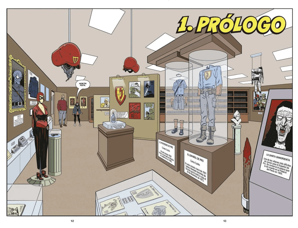 Y hablando de un villano de brocha gorda, Jose Antonio Vaca, el antiguo ayudante de Pro convertido en un ultraderechista magnate de los negocios, no puede caer más en el cliché y el personaje unidimensional. Este para mi es el elemento más flojo del comic que provoca que una narración correcta se venga abajo ante un villano de folletín que sólo quiere volver a los tiempos mejores de la dictadura. Esta parte es la que nos da la parte superhéroica del comic, y es en la que más falla este comic. Porque la historio de Galán niega a Pro la posibilidad de mostrarse como el héroe que debería haber sido, fallando durante toda su vida e incluso en el momento clave del comic. Incluso aunque la historia pueda decir que lo justifica al haber visto en el futuro la estatua donde aparece la fecha de su muerte. Hablando del climax final, este falla por el problema del dibujo de Vidal al que he hecho mención antes, pero también por la propia premisa de hacer de Pro una víctima toda su vida que no consigue salvar a nadie, teniendo que dejar paso a la verdadera heroína del comic, una nacida en democracia.
