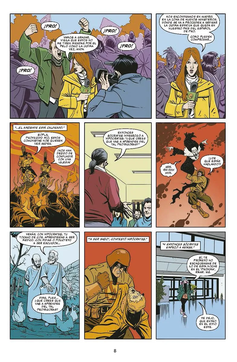 Y hablando de un villano de brocha gorda, Jose Antonio Vaca, el antiguo ayudante de Pro convertido en un ultraderechista magnate de los negocios, no puede caer más en el cliché y el personaje unidimensional. Este para mi es el elemento más flojo del comic que provoca que una narración correcta se venga abajo ante un villano de folletín que sólo quiere volver a los tiempos mejores de la dictadura. Esta parte es la que nos da la parte superhéroica del comic, y es en la que más falla este comic. Porque la historio de Galán niega a Pro la posibilidad de mostrarse como el héroe que debería haber sido, fallando durante toda su vida e incluso en el momento clave del comic. Incluso aunque la historia pueda decir que lo justifica al haber visto en el futuro la estatua donde aparece la fecha de su muerte. Hablando del climax final, este falla por el problema del dibujo de Vidal al que he hecho mención antes, pero también por la propia premisa de hacer de Pro una víctima toda su vida que no consigue salvar a nadie, teniendo que dejar paso a la verdadera heroína del comic, una nacida en democracia.