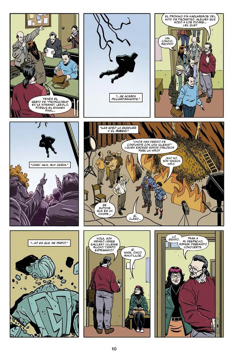 Por no decirlo todo negativo, me gusta el diseño de personajes de Manuel M. Vidal, empezando por el Protagonista Pro, la versión femenina que veremos a lo largo del comic, Zorra Roja, etc. Que incluso una persona normal como Galilea tenga una imagen reconocible me parece muy chulo. También me gusta la expresión facial de los personajes cuando hablan, y cómo los diálogos de Galán funcionan gracias a su dibujo. Aunque no creo que sea nada especialmente reseñable, Vidal cambia algunas páginas del comic para adaptar su estilo de dibujo al de los comics de los años 50 y 60, españoles y americanos, y en otro momento al estilo manga más actual. He leído a varias personas comentar lo genial que es esto, pero parece lo mínimo exigible en un comic que plantea una historia de esta naturaleza.