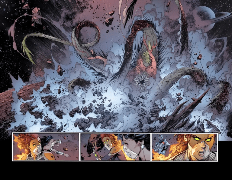 Entrando en las historias de Tom Taylor, empezando por las cosas positivas, me gusta la falta de ego de un escritor cuando comprende que lo excepcional de un comic es el dibujo de Redondo y sabe quitarse de en medio y plantear argumentos que ayuden al lucimiento de su colaborador. En este mundo de personalismos, me gusta mucho la capacidad de saber jugar en equipo de Taylor.