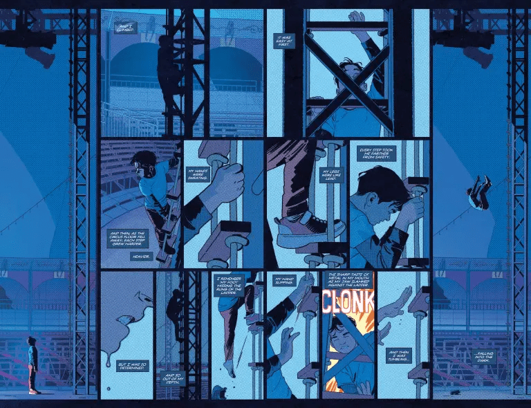 Fallen Grayson nos muestra el plan de Heartless para destruir todo lo que Dick Grayson ha construido para ayudar a la gente de Bludhaven. La historia tiene un montón de convencionalismos para hacer avanzar este plan que en realidad no molesta porque sin eso no hay historia. Lo que nos lleva al clásico «fall-from-grace» que nos lleva a que Dick se levante de cara al contraataque que tendremos en el climax final del último número. Un tema importante del último año y pico de historias de Taylor es que Dick sufre unos ataques de pánico (o de vértigo) cada vez que se subía a un lugar elevado, lo que obviamente le impedía realizar muchas de su labores de superhéroe. La explicación del motivo de este vértigo y su conexión con el pasado de Dick y la muerte de sus padres acaba siendo una pequeña gran chorrada que resume en parte los problemas de las historias de Nightwing de Tom Taylor una vez perdían el salvavidas del dibujo de Redondo.