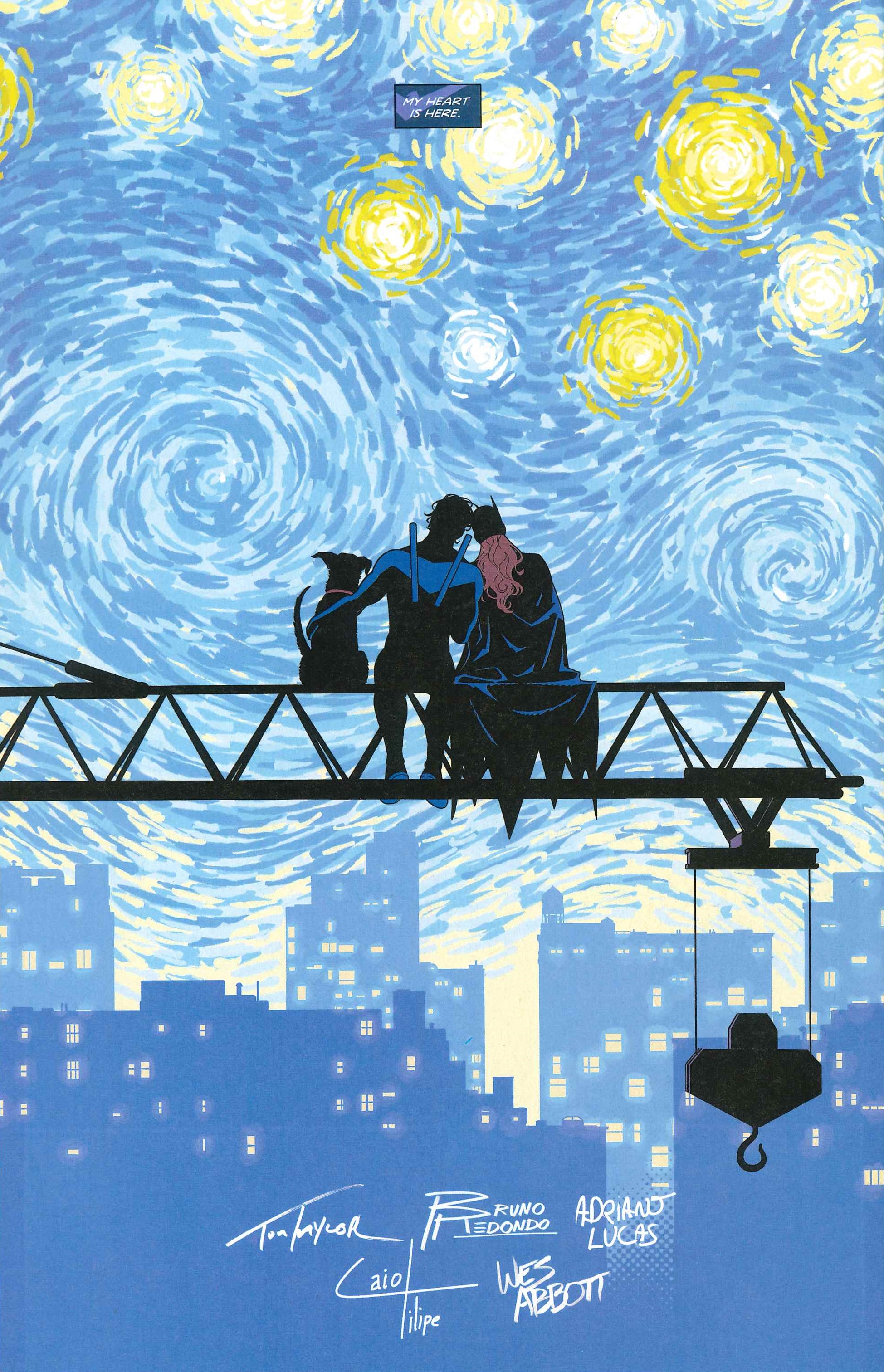 Quiero terminar esta entrada con la última página de esta etapa, que Redondo dibuja y colorea. Una pagina maravillosa que homenajea el cuadro Noche estrellada de Van Gogh y que me parece una maravilla que transmite perfectamente la emoción que nos ha dado este comic. A pesar de las cosas con las que no he conectado, quiero dar las gracias a Taylor, Redondo y todo el equipo de DC por esta etapa de Nightwing. Conseguisteis entrar en mi corazón y es algo que recordaré toda la vida.