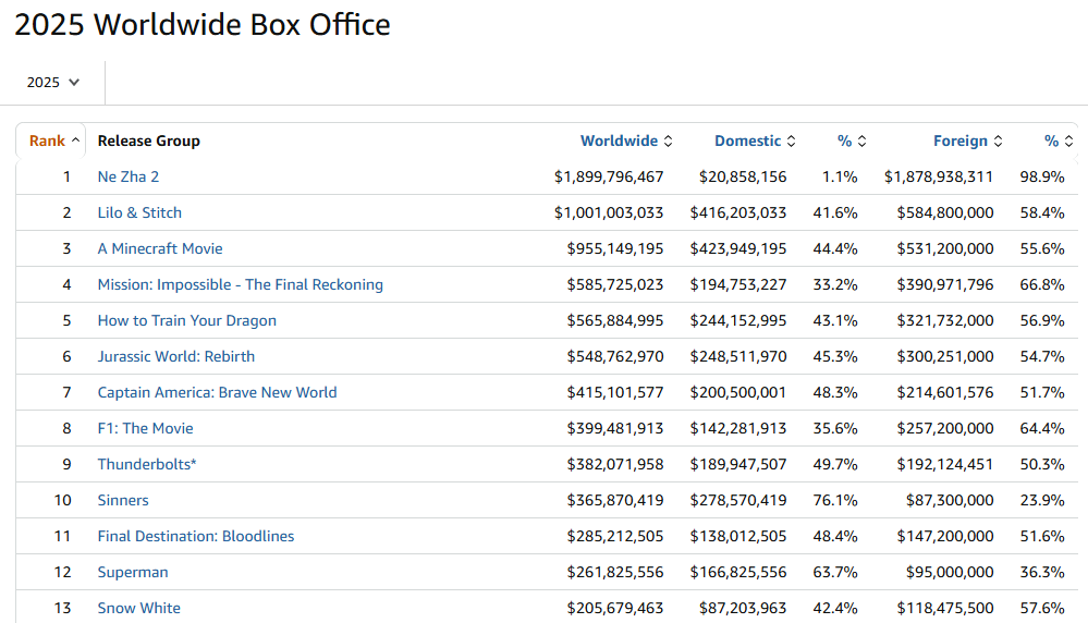 La última película de Misión Imposible se encuentra en tercer lugar con casi 600 millones recaudados, una recaudación importante que queda lastrado por el enorme presupuesto de la película, superior a los 300 millones. Tras Ethan Hunt tenemos dos de los éxitos del verano, La versión en imagen real de Cómo entrenar a tu dragón y Jurassic World El Renacer. Dos franquicias que van a ser rentables este año gracias a haber ajustado los costes de producción por debajo de los 200 millones.
