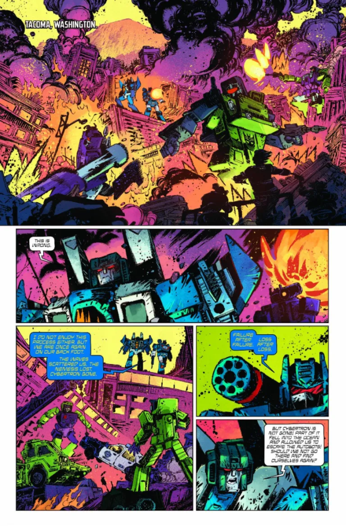 En este tercer arco asistimos a una acción desdoblada a múltiples frentes, consiguiendo que todas las tramas se desarrollen de forma estupenda, dejándonos con momentos de gran tensión. Porque el uso del cliffhanger es sin duda otra de sus grandes virtudes. Por un lado asistimos a la lucha por el control de los decepticons. Starscream y sus Combaticons se enfrentan a Soundwave y Devastator en una lucha que está destruyendo la ciudad de Seattle. Cogidos en el fuego cruzado, Optimus Prime intentará proteger a tantos humanos como esté en su mano.