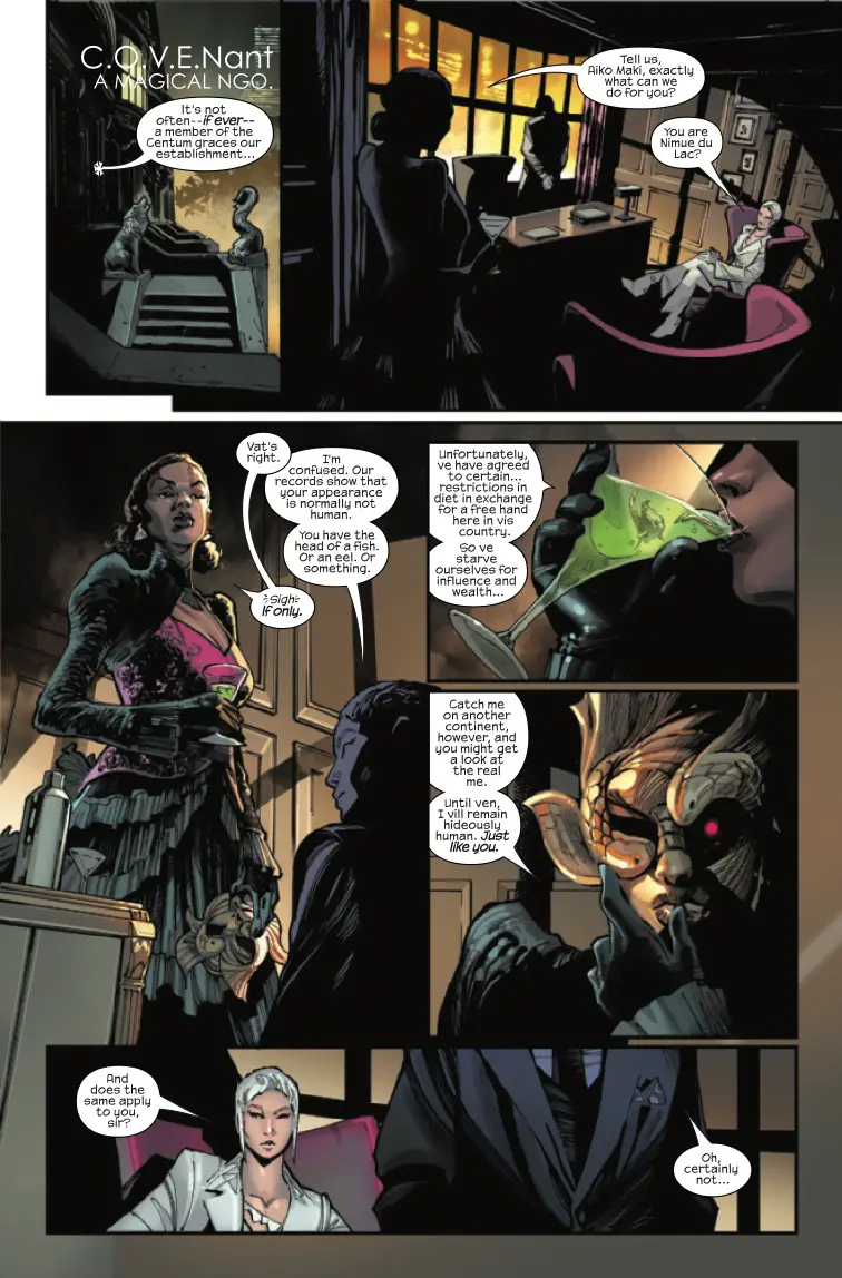 Hickman continúa con su historia que supuestamente está revolucionando el mundo mágico y sobrenatural del Universo Marvel. Y lo hace con un número unitario protagonizado por Aiko Maki, la antigua espesa de Wyn y actual centivar del Orden Natural de Todo. En esta grapa intentará deshacer el error que cometió cuando captó a Mia DiMaria para el Orden Natural de Todo, privándola de poder desarrollar en plenitud sus habilidades mágicas. En realidad, dentro que todo es correcto, esta trama tiene un problema de base, y es que nunca hemos llegado a saber exáctamente qué es el Orden Natural de Todo, de donde surge su poder y cual es la diferencia que tienen con los Poderes Fácticos que alimentan el poder de Wyn. De hecho, no dejo de leer en el prólogo de cada grapa lo de «una alianza incómoda entre ciencia y magia» para definir la relación entre estos poderes pero al final queda como una frase vacía sin interés dado que Hickman no se ha molestado en responderla.