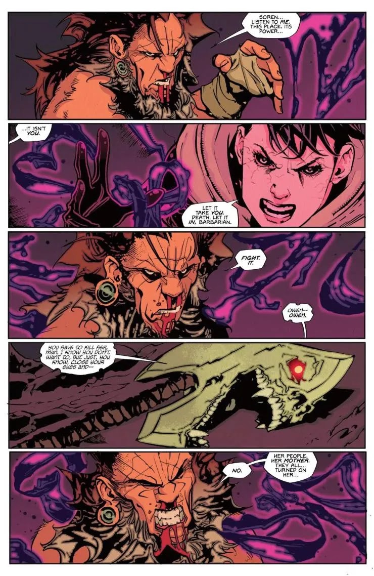 Barbaric me ha parecido un comic super divertido. Michael Moreci plantea un comic de aventuras super entretenido que juega a reirse de algunos de los convencionalismos del género de la espada y brujería. Todo tiene una vertiente irónica estupenda, empezando con que el bárbaro protagonista en realidad se llame Owen, un nombre nada heroico ni bárbaro. Otro de los elementos que enfatiza el elemento de romper con los convencionalismos son los compañeros de aventuras del bárbaro: Un hacha poseída adicta a la sangre que es la brújula moral de Owen y Soren, una joven nigromante que en realidad es buena persona a pesar de estar en contacto con la magia de los muertos.