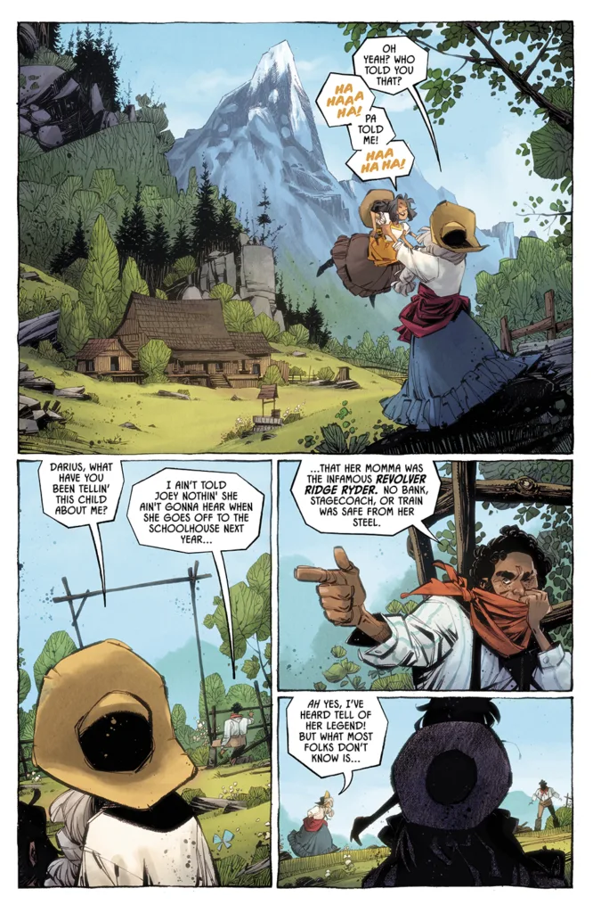El duo Skottie Young y Jorge Corona me parece que un equipo creativo perfectamente engrasado. El hecho de que este es el tercer trabajo en el que colaboran me indica que ambos trabajan muy a gusto, y es algo que se nota. Ain´t no grave es un western sobrenatural en el que una antigua ladrona y asesina inicia un viaje para buscar a la MUERTE, para evitar morir y abandonar a su marido y a su hija pequeña. Este viaje físico y onírico de Ryder dará para momentos muy potentes visualmente. Y para una pregunta muy potente. El que una persona haya abandonado su vida de crímenes al nacer su hija ¿hace que se olviden sus crímenes y asesinatos previos?