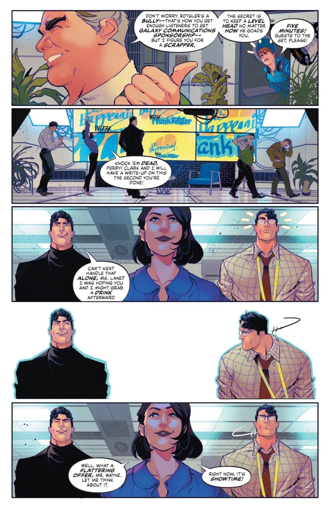 Una amenaza acecha Metrópolis, pero Superman y Batman no pueden hacer nada al respecto hasta que Clark Kent y Bruce Wayne encuentren la manera de escapar… ¿de un programa de entrevistas? ¿Dependerá de sus amigos —Perry White, Lois Lane, el comisario Gordon y Alfred Pennyworth— intervenir y ayudar a salvar el día?