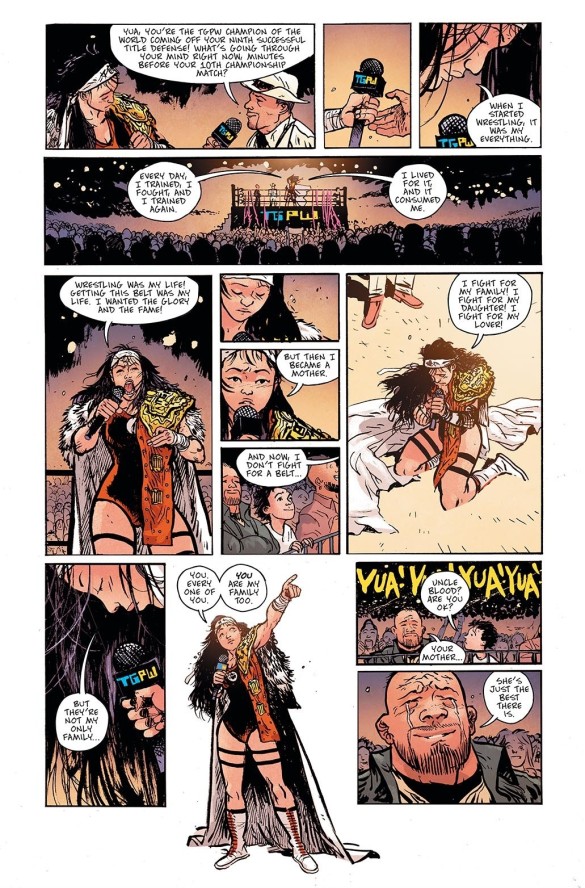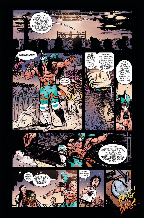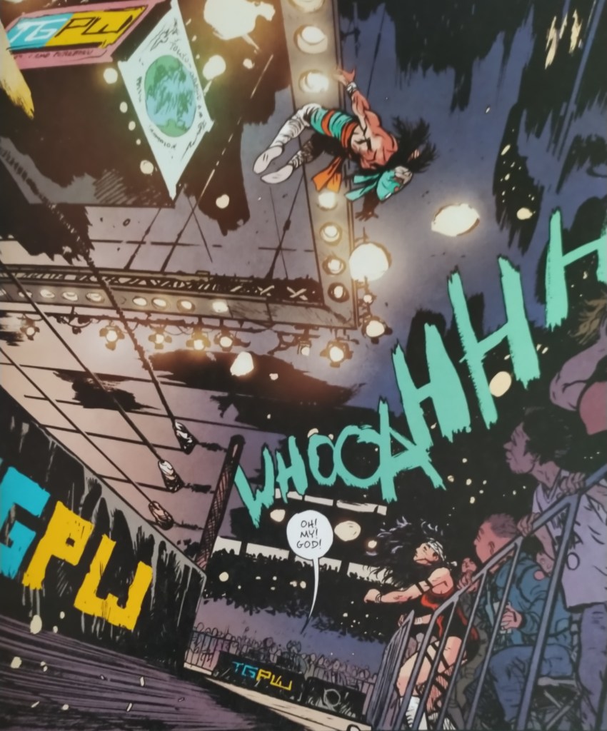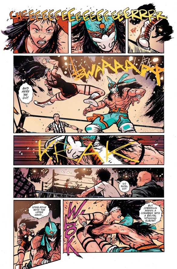Dentro de ser un número más expositivo que de acción, DWJ plantea un combate brutal dentro de esta grapa y consigue que nos de pena ver la paliza que sufre Cobrasun en el ring. Sobre todo teniendo en cuenta que fue su error lo que provocó la muerte de la madre de Lona, la campeona Yua Steelrose, y por tanto debería caernos mal y dirigir contra él toda nuestra ira. Esto también es otro ejemplo de buena escritura.