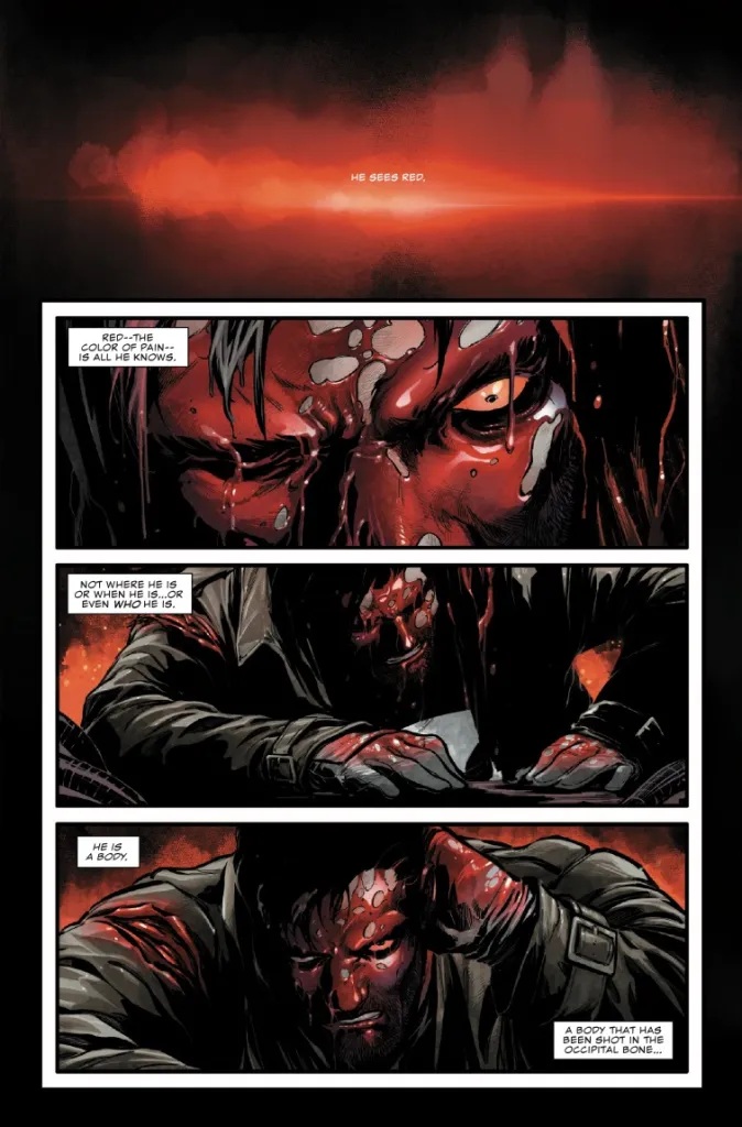 Luego está la clasificación Red Band de esta serie de The Punisher. En el primer número si vimos masacres que justificaban la clasificación «Para adultos» y la bolsa de plástico para que no se pueda abrir la grapa en las tienas. Pero en realidad en esta segunda grapa no hay apenas nada, dejando al descubierto la naturaleza de gimmick comercial que rodea al concepto Red Band. Frank dispara a un pavo a la mano y su huesos estallan, y luego Wilson Fisk se flagela ¿por que sí? Eso es todo. Muy poco. Y un poco ridículo.